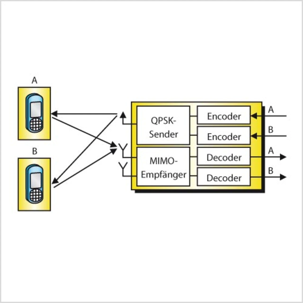 Gleich zwei Verfahren mussten die Entwickler hier implementieren: Die Signale im Downlink werden in einem vierwertigen (quaternären) Modulationsverfahren, der Quadratur-Phasenumtastung (QPSK – Quaternary Phase Shift Keying), codiert. Für den Uplink werden so genannte räumlich orthogonale, also voneinander unabhängige Sub-Kanäle genutzt. Dieses Verfahren ist unter der Bezeichnung Multi-User-MIMO (Multiple Input Multiple Output) bekannt. Um nun 2 × 2 SAIC-Handys (Single Antenna Interference Cancellation) über einen Kanal miteinander zu verbinden, muss darüber hinaus die Datenübertragungsrate jeweils halbiert werden. Dies gelingt mit dem AMR-Verfahren (Adaptive Multi-Rate), das die Datenübertragungsrate der Gespräche laufend anpasst. Das Verfahren kann auch von Handys genutzt werden, die mit der VAMOS-Option (Voice services over Adaptive Multi-user channels on One Slot) nach der 3GPP-Definition (Third Generation Partnership Project – www.3gpp.org) ausgestattet sind.
