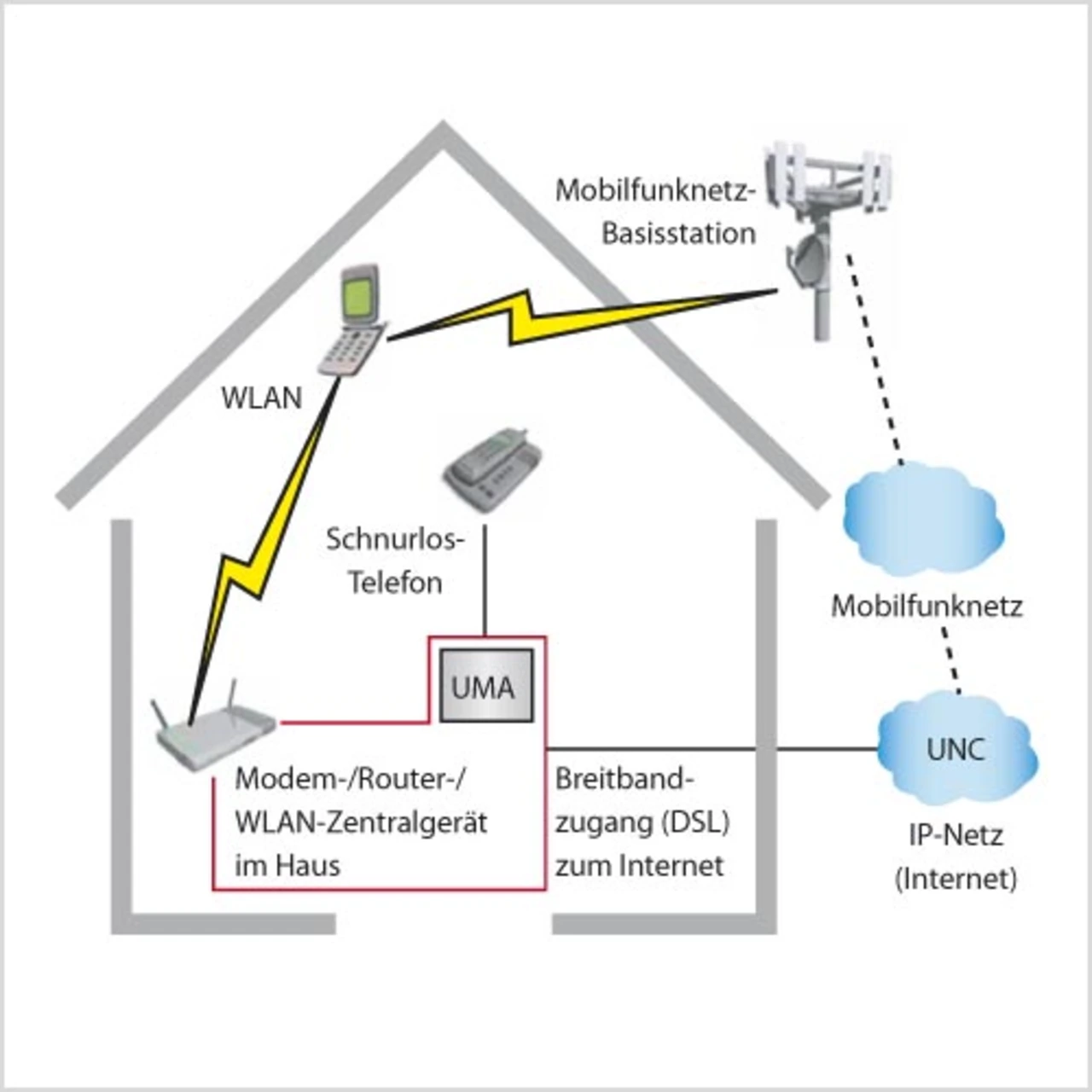 Durch die Dual-Mode-Fähigkeit neuer Telefone wäre es denkbar, dass ein Telefongespräch uneingeschränkt vom Mobilfunknetz, wo es im Minutentakt abgerechnet wird, beispielsweise an das heimische WLAN des Benutzers übergeben wird. Dort wird es als VoIP-Verbindung geführt, die unter eine monatliche Flatrate fällt (Bild 1). Das hätte für die Teilnehmer den Vorteil, dass sie die Festnetztelefonie durch einen kostengünstigeren Mobilfunkdienst ersetzen könnten, da es sich zumindest bei einem Teil der Verbindungen um Low-Cost-VoIPAnrufe über das IP-Netz handeln würde. Vorteil für die Netzwerkbetreiber: Sie könnten den Festnetzanbietern Umsatzanteile wegnehmen und deren Kunden weiter an sich binden.