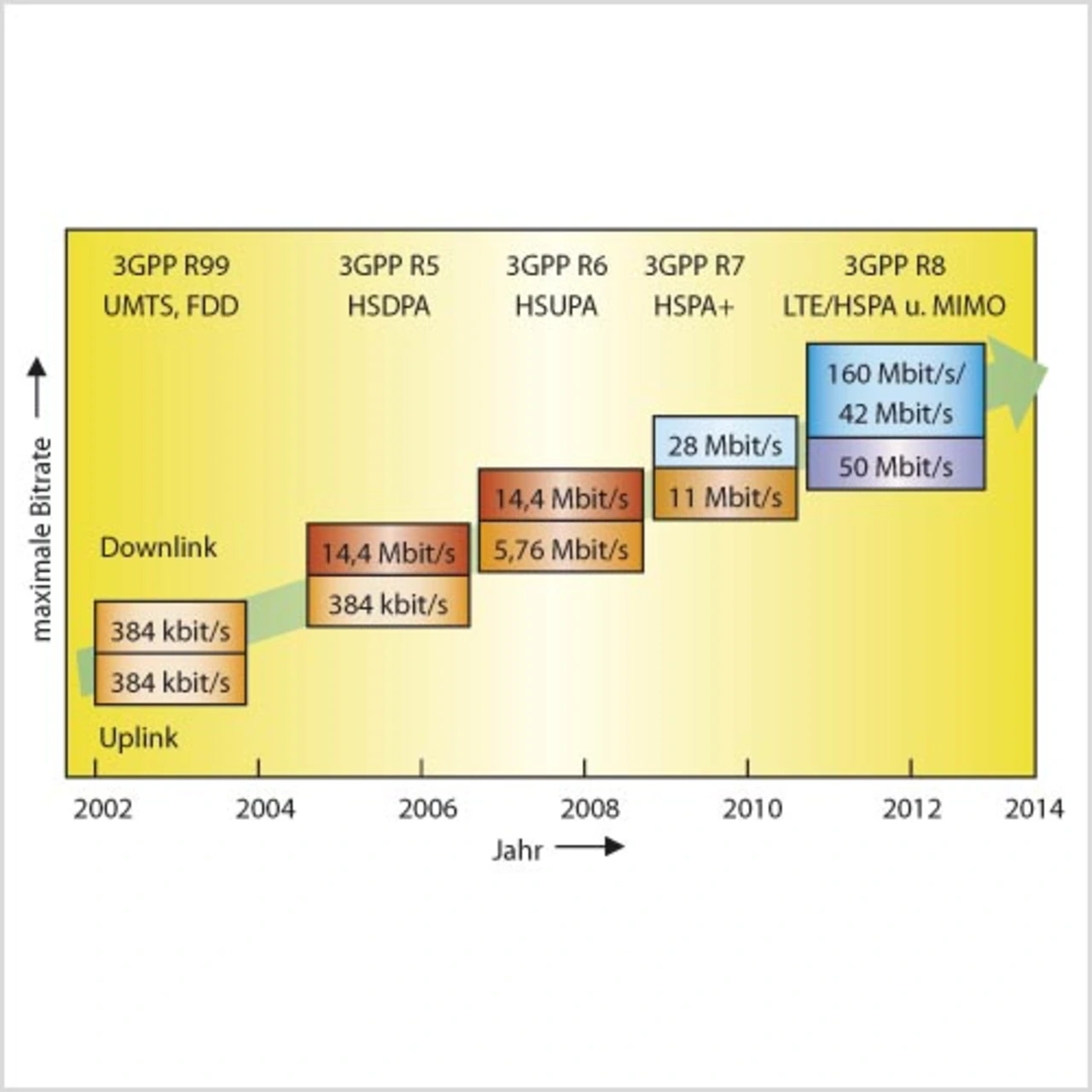 Einen Überblick über die Weiterentwicklung des Standards UMTS in Europa und die erreichbaren Datenraten gibt Bild 1. Die wesentlichen Forschungsarbeiten zu Wideband-CDMA-Systemen fanden bereits in den 1990er Jahren statt. Sie bildeten die Basis für die Standardisierungsarbeiten von 3GPP, wobei die erste Version des Standards als „Release 99“ bereits Ende 1999 verabschiedet wurde. Der kommerzielle Netzbetrieb wurde in Japan im Jahre 2001 aufgenommen, in Europa ein Jahr später. Obwohl mit UMTS Release 99 theoretisch Datenraten von bis zu 2 Mbit/s möglich sind, stellen die in Bild 1 angegebenen 384 kbit/s den realistischeren Wert für die in der Praxis erreichbare maximale Datenrate dar.