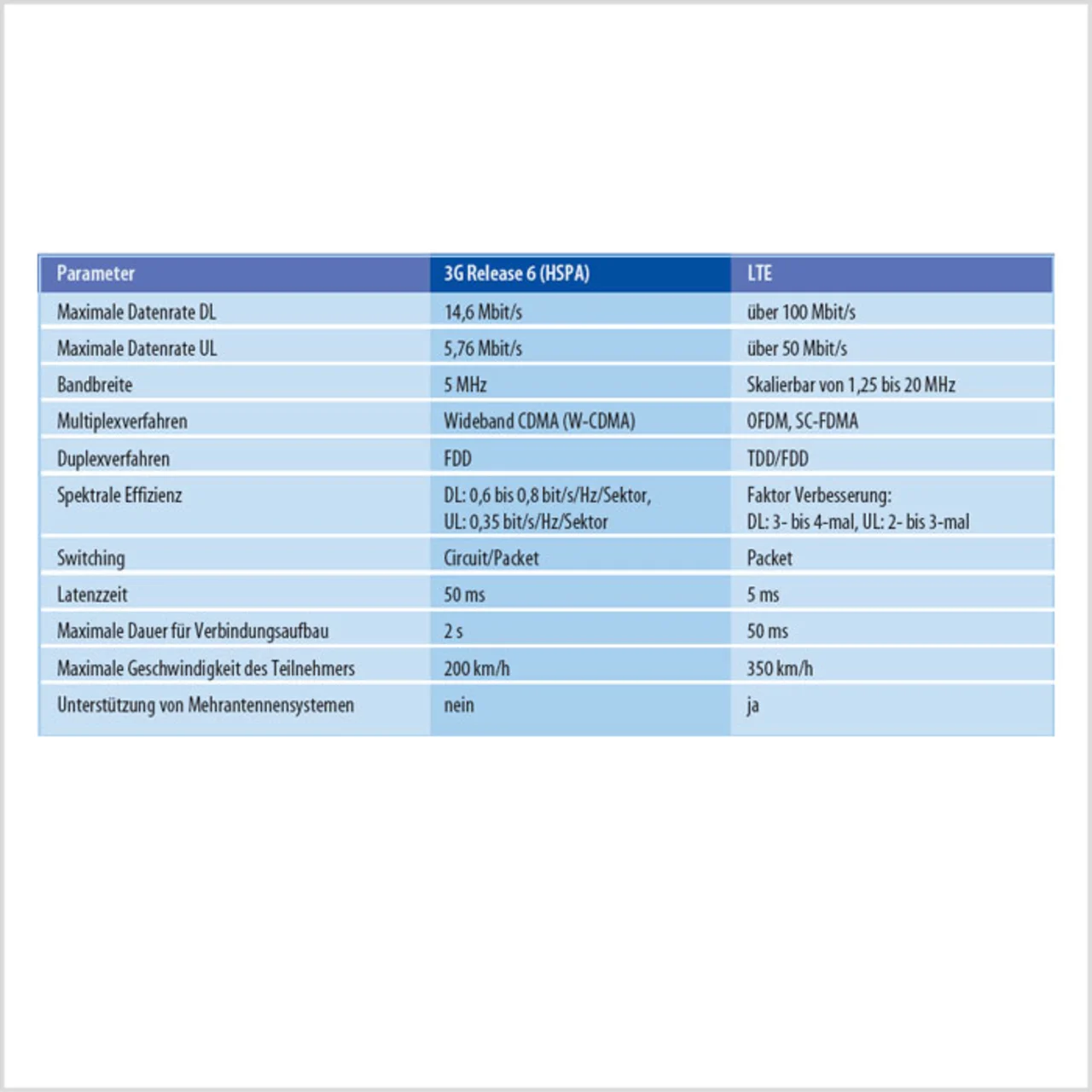 Wie schon UMTS, so muss auch LTE mit den Vorgängersystemen der zweiten und dritten Mobilfunkgeneration koexistieren. Multimode-Geräte, basierend auf flexiblen Architekturkonzepten, werden daher gerade für LTE verstärkt zum Einsatz kommen. Einige wichtige Parameter von LTE im Vergleich zu denen der dritten Mobilfunkgeneration sind in der Tabelle aufgelistet.
