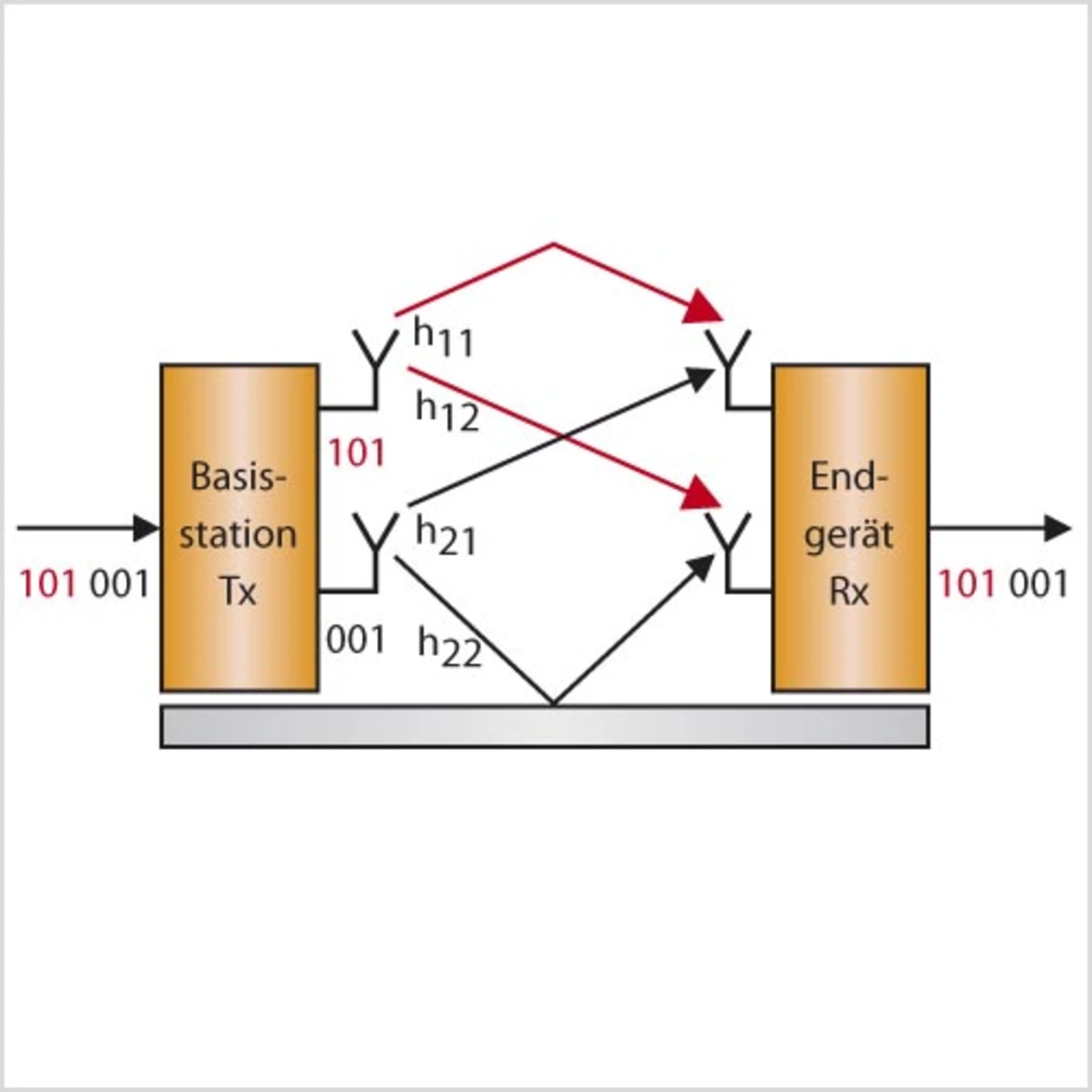 Als Grundkonfiguration für den Downlink ist ein 2×2-MIMO-System im Standard vorgesehen, also eine Anordnung mit zwei Sende- und zwei Empfangsantennen, wie in Bild 5 dargestellt. Darüber hinaus ist eine Erweiterung auf eine 4×4-Anordnung möglich.