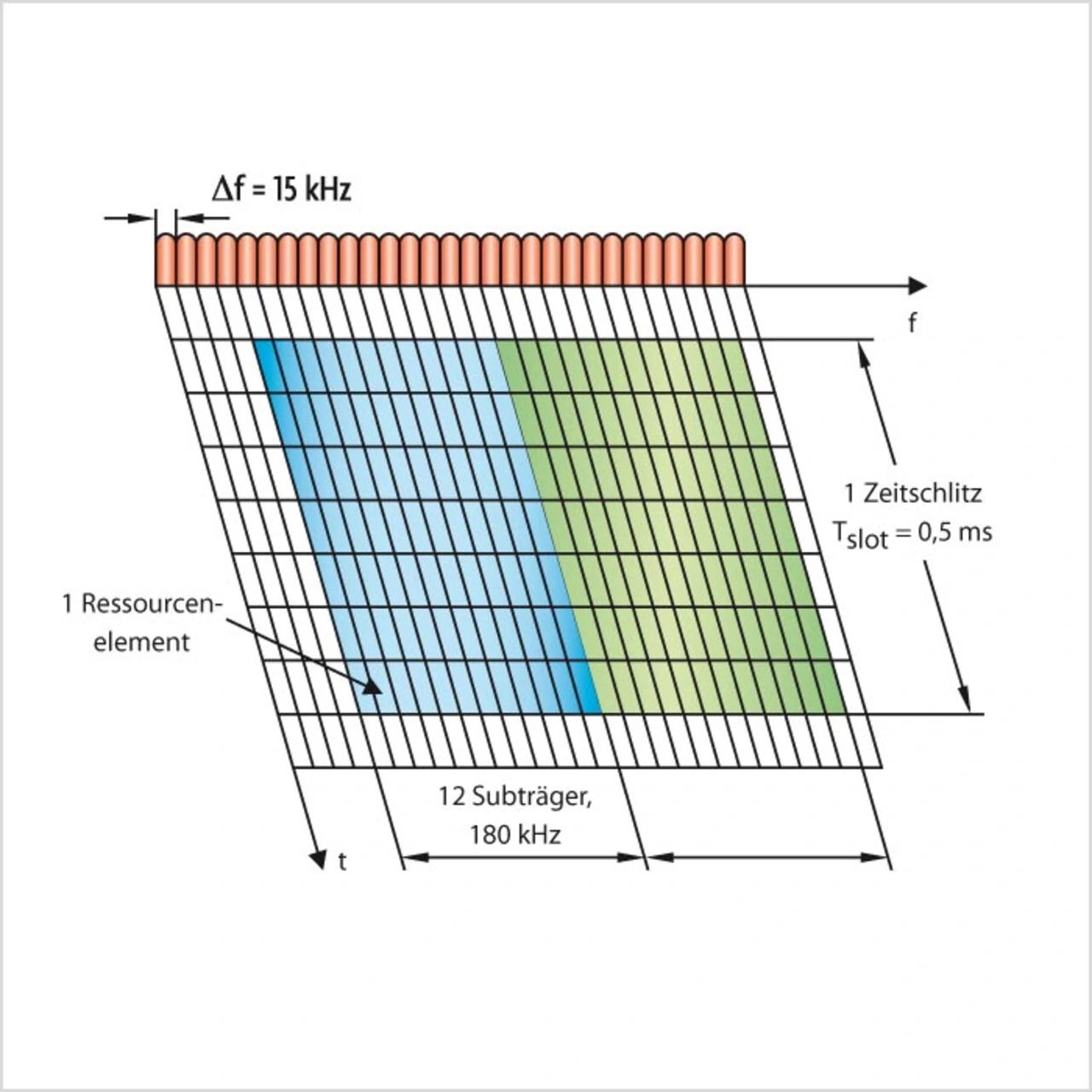 Die OFDM-Symbole werden zu Ressourcenblöcken im Frequenz- und Zeitbereich zusammengefasst. Die Ressourcenblöcke haben einen Wert von 180 kHz im Frequenzbereich und 0,5 ms im Zeitbereich und bestehen aus 84 Ressourcenelementen. Jedes „Transmission Time Interval“ (TTI) besteht wiederum aus zwei Zeitschlitzen, so dass dieses Intervall eine Dauer von 1 ms hat. Durch dieses im Vergleich zu UMTS verkürzte TTI können die Latenzzeiten deutlich reduziert werden (siehe Tabelle).