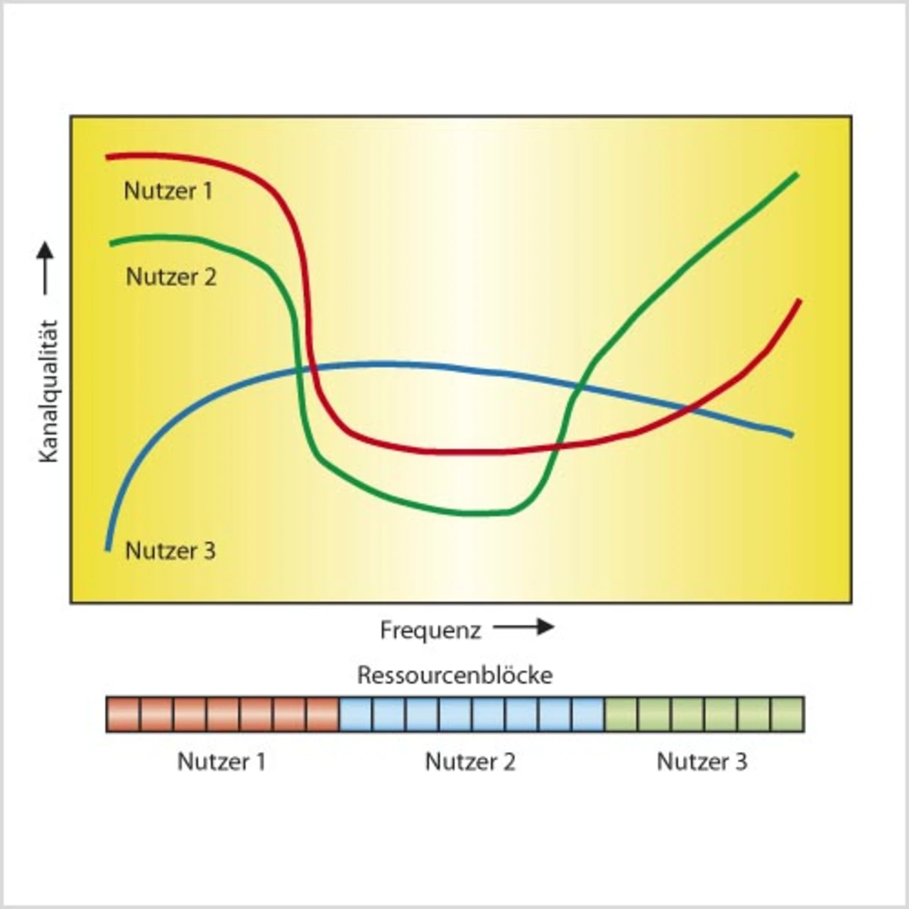 Der so genannte „Scheduler“ ist ein Schlüsselelement zur Realisierung eines großen Datendurchsatzes. Denn der Scheduler entscheidet in Zusammenarbeit mit dem „Link-Adaption-Algorithmus“ für jedes Zeitintervall, welchem Endgerät welche Datenrate zugewiesen wird. Der Datendurchsatz lässt sich deutlich steigern, wenn beim „Scheduling“ zusätzlich die augenblickliche Kanalqualität berücksichtigt wird. Da die Kanalqualität für die einzelnen Endgeräte unabhängig voneinander variiert, kann die höchste Datenrate realisiert werden, wenn jeweils der Teilnehmer mit der augenblicklich besten Kanalqualität bevorzugt bedient wird. Insbesondere wird durch OFDM als Zugriffsverfahren auch das „Scheduling“ im Frequenzbereich möglich, bei dem jeder Verbindung das Frequenzband bzw. die Ressourcenblöcke zugewiesen werden, die augenblicklich die besten Übertragungsbedingungen aufweisen, wie in Bild 2 veranschaulicht wird.