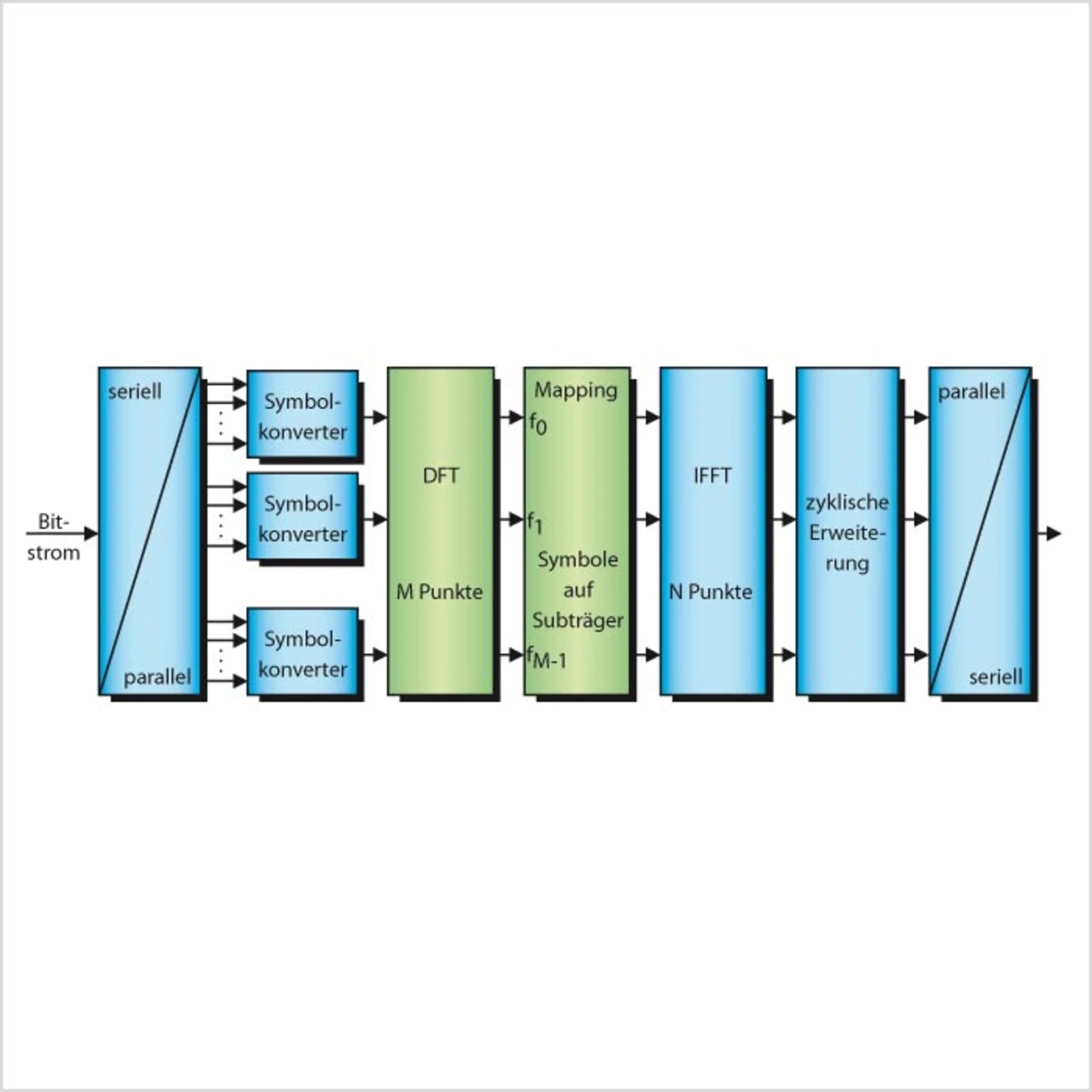 Um diesen Nachteil zu umgehen, wird im Uplink von LTE eine vorcodierte Version von OFDM verwendet, die als „Single-Carier Frequency Division Multiple Access“ (SC-FDMA) bezeichnet wird. Die entsprechenden Funktionsblöcke sind in Bild 4 dargestellt: Nachdem durch den Symbolkonverter die Abbildung des Bitstroms auf die QAM-Symbole vollzogen ist, erfolgt die Vorcodierung über den zusätzlichen DFT-Block, der beim klassischen OFDM-Verfahren nicht benötigt wird. Dieser Block spreizt M Symbole auf die M Subträger, wobei die Zuordnung über den entsprechenden Mapping-Block erfolgt. Die Übertragung des Datenstroms erfolgt schließlich nur noch über einen einzelnen Träger, da die FFT über M Punkte und die größere IFFT über N Punkte sich gegenseitig kompensieren, so dass ein Einträgersignal im Zeitbereich erzeugt wird. Die Ressourcenblöcke werden so gruppiert, dass sich die Linearitätsanforderungen an die Endstufe deutlich reduzieren.