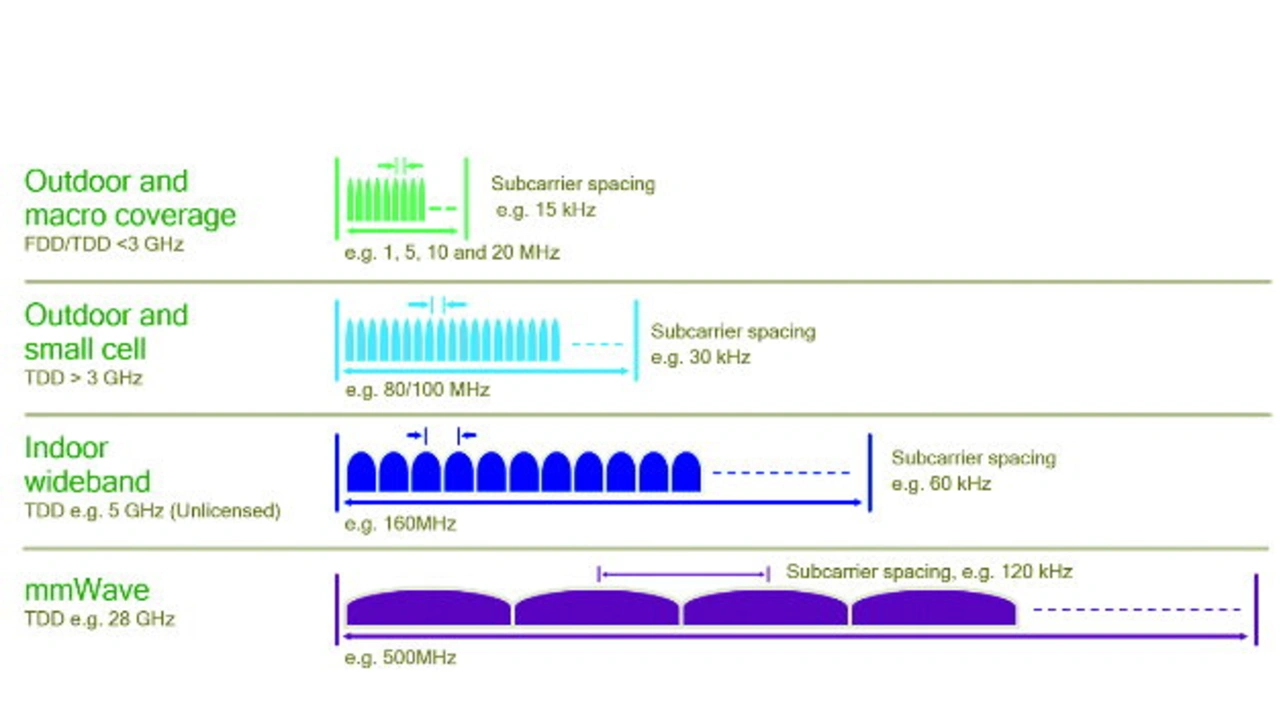 Da man im IoT-Geschäft nur von wenigen Fixpunkten ausgehen kann, soll 5G flexibel und anpassungsfähig für zukünftige Marktentwicklungen sein, ohne dabei die Kompatibilität einzubüßen. Für die Luftschnittstelle 5G NR bedeutet das, nicht nur in der Frequenzdomäne flexibel zu sein, sondern auch in der Zeitdomäne. Damit sollen unter anderem die Latenzzeiten reduziert werden. So ist geplant das Transmission Time Interval (TTI) skalierbarer zu machen, um deutlich unter das 1-ms-TTI von LTE zu kommen. Zusätzlich soll das TTI Multiplexing sich an Symbol-Grenzen orientieren und nicht an den Subframes, um so Latenz-sensible Übertragungen möglichst rasch auf den Weg zu bringen, statt auf den Anfang eines neuen Subframes warten zu müssen. Auch die Subframes selbst sollen für eine geringere Latenz optimiert werden, indem die Datenübertragung und die Bestätigung (ACK) im selben Subframe erfolgt.