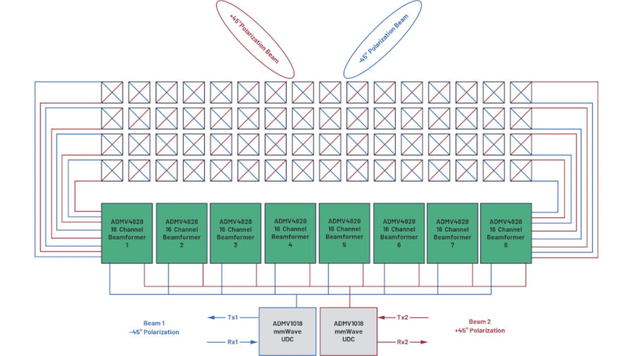 Analog Devices bietet aktive Beamforming-ICs an, die 16 komplette Sende- und Empfangskanäle mit zugehörigen Leistungsverstärkern und rauscharmen Verstärkern (LNA) sowie Phasen- und Verstärkungssteuerungen pro Kanal und Schaltfunktionen für Zeitduplexverfahren (TDD) enthalten. Und das alles integriert auf einem einzigen Stück Silizium.