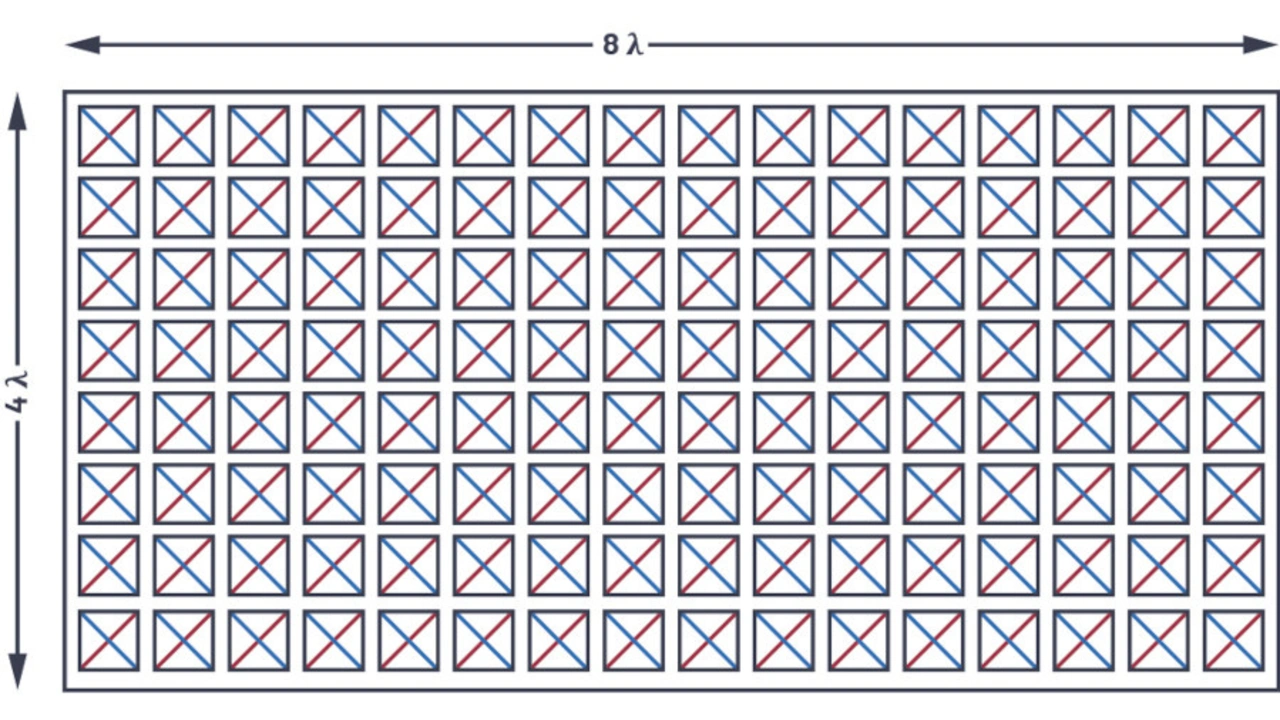 Bild 1 stellt ein Antennenarray mit 256 Elementen dar, das aus acht Zeilen und 16 Spalten mit doppelt polarisierten Strahlerelementen besteht. Die roten und blauen Linien zeigen die +45 ° beziehungsweise –45 ° polarisierten Antennenelemente.