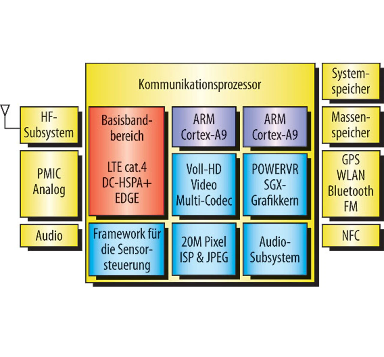 Die Plattform MP5232 (Bild 1) basiert auf einem Single-Chip-Kommunikationsprozessor, der Renesas Mobiles 2G/3G/LTE-Multimode-Modem-Konzept mit einem modernen Multi-Core-Applikationsprozessor vereint. Das FDD/TDD-LTE-Modem der Kategorie 4 kann Datenraten bis zu 150 Mbit/s im Download und 50 Mbit/s im Upload übertragen. Der Applikationsprozessor MP5232 unterstützt SMP-Multicore-Verarbeitung mit Full-HD-1080p-Video in höchster Qualität, kann Daten von Kameras mit bis zu 20 MPixel verarbeiten und bietet eine Grafikbeschleunigung wie in heutigen Spielekonsolen. Kombiniert mit einer hochwertigen Spei-cherarchitektur erlaubt er, den Zugriff auf den externen Speicher zu reduzieren, um so die leistungshungrigsten Multimedia-Applikationen mit minimaler Stromaufnahme zu unterstützen.