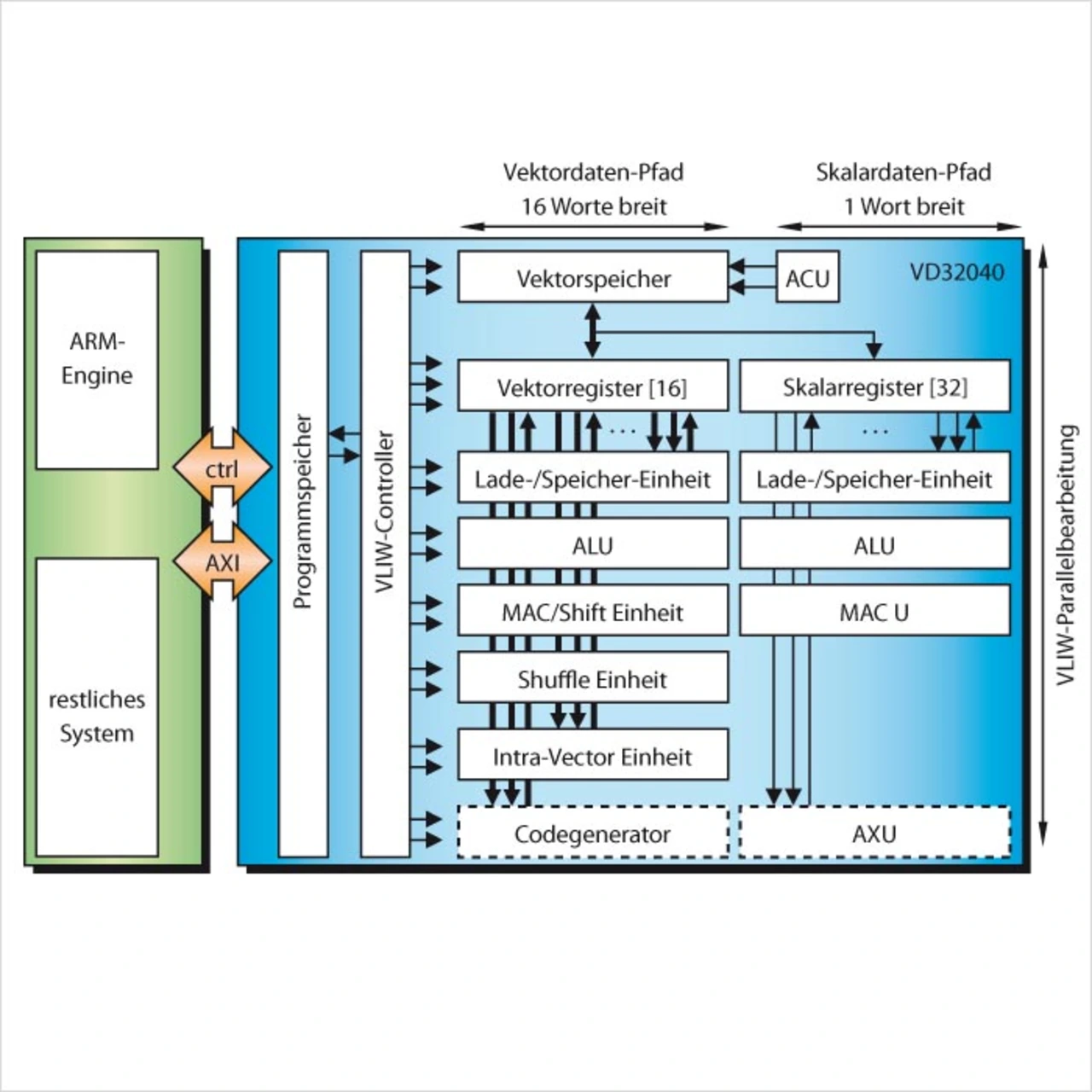 Der Kern des Prozessors basiert auf einem SIMD-ähnlichen Datenpfad (Single Instruction Multiple Data), der durch Hinzufügung von „Intra-Vektor-Operationen“ erweitert wird und damit eine zusätzliche Interaktion zwischen den einzelnen Elementen innerhalb eines Vektors erlaubt (Permutationen, Hinzufügungen, Max.-/Min.-Suchen usw.). Damit vergrößert sich der Bereich von Algorithmen, die auf diesem Kern abgebildet werden können. Mit seinem Einsatz auf Vektoren von typischerweise 256 bit kann er dabei 16 Operationen auf 16 Bitdatenelementen pro Funktionseinheit verarbeiten. Aufgrund der höheren VLIW-Parallelität (Very Long Instruction Word) ergibt das 100 Operationen pro Zyklus und bietet damit eine erhebliche Rechnerleistung, ohne im GHz-Taktfrequenzbereich arbeiten zu müssen. Dies ermöglicht eine besonders energieeffiziente Form der Implementierung bei Verwendung einer Standard-Bibliothekssynthese. Die Programmierung des Prozessors erfolgt in ANSI-C; die Verarbeitung der Vektorfunktionen mit Intrinsics. Ebenfalls zum Einsatz kommen eine C++-Host-Emulationsbibliothek, ein Compiler mit einem im Vergleich zur klassischen Assembly-Programmierung höheren Abstraktionsgrad sowie ein Verknüpfer, ein zyklen- und bitgenauer Simulator und ein Debugger/Profiler.