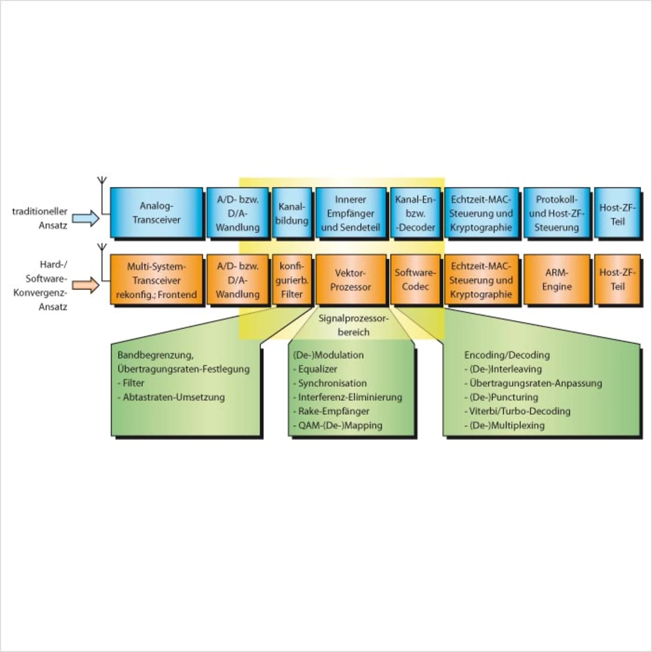Die Software-Programmierung von Vektorprozessoren sollte jedoch nur in solchen Fällen Anwendung finden, in denen sich durch kürzere Markteinführungszeiten, eine höhere Produktdifferenzierung oder geringere Fertigungskosten ein echter Mehrwert erzielen lässt. Es gibt heute noch einige Bereiche der Basisbandverarbeitung, bei denen eine software-programmierte Modemfunktion unter Umständen nicht die Lösung erster Wahl ist, sondern wo eine Anwendung von mehreren festverdrahteten, dedizierten Sub-Modulen eine bessere Alternative darstellt.