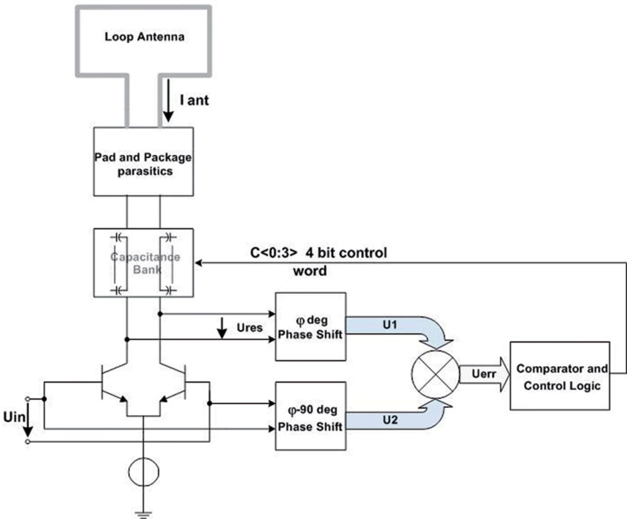 Und so funktioniert der automatische Antennenabgleich (Bild 4): Der Ausgangszweig schließt die Antenne, eine Kapazitätsbank sowie die verschiedenen parasitären Elemente von Gehäuse, Bondpads und Bondwires ein. Dabei kann der Ausgangsblock als RLC-Parallelschwingkreis modelliert werden. Damit beträgt im Resonanzfall die Phasenverschiebung zwischen dem Kollektorausgangsstrom und der differenziellen Spannung an den Kollektoren insgesamt 180°. Da die Phasenverschiebung zwischen dem Strom am Kollektor und der Basisspannung der Ausgangstransistoren konstant ist, wird die Spannung mit der Kollektorspannung verglichen. Die dazu verwendeten Phasenschieber weisen über den Bereich von 300 MHz bis 1000 MHz eine Phasenverschiebung von 90° auf. Der Gleichspannungsanteil, der bei einer Fehlanpassung am Mischerausgang entsteht, wird mit einem Komparator überwacht. Der Ausgangswert des Komparators (ein Kontrollwort mit vier Bit Länge) regelt die Kapazitätsbank so lange nach, bis die Ausgangsspannung am Mischer den Wert Null erreicht. In diesem Fall ist der Schaltkreis inklusive aller parasitären Elemente optimal auf die Resonanz abgestimmt. Dieser Abgleich dauert maximal 6,4 µs und erfolgt zu Beginn jedes Sendezyklus’, um sich den geänderten Umgebungseinflüssen optimal anpassen zu können.