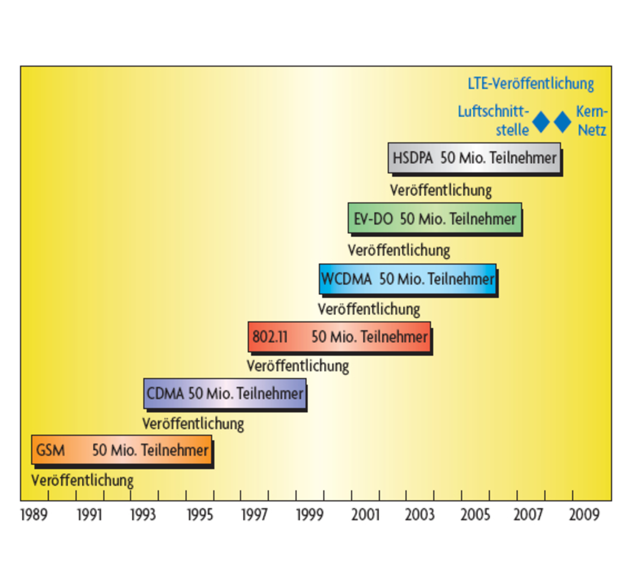 Bild 1 verdeutlicht in diesem Zusammenhang, wie lange es gedauert hat, bis die einzelnen Technologien und Standards Massentauglichkeit bewiesen haben und somit den „Durchbruch“ erzielten. Laut Marktbeobachtern, Herstellern und Analysten wird der Endverbraucher erst Ende 2011 Handsets in ausreichender Anzahl und Modellvielfalt in Händen halten. Anfang 2011 werden erste Datenprodukte erwartet, also USB-Sticks, PCMCIA-Karten und Embedded-Lösungen, die in Laptops, Webbooks und anderen mobilen Computerprodukten integriert werden.