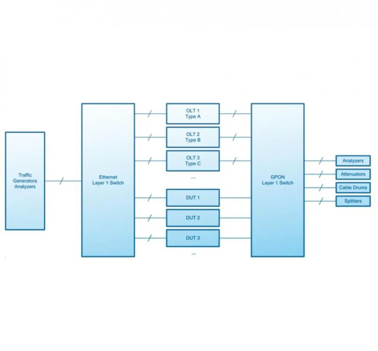 Ein weiterer Schwerpunkt lag auf automatisierten Interoperabilitätstests mit wechselnden Endgeräten, insbesondere auf der optischen Strecke sowie der Unterstützung von standardisierten Tests entsprechend der Definitionen von ITU-T, des FSAN-Konsortiums (Full Service Access Network) sowie des Broadband Forums. Anforderungen schlossen die automatische Erweiterbarkeit des zu testenden optischen Netzes im Rahmen einer automatisierten Testabfolge, z.B. automatisches Hinzufügen von Splitterports oder Kabelstrecken innerhalb des optischen Netzes ein. Das flexible Verbinden von Test- und Analysegeräten mit den zu untersuchenden Endgeräten einschließlich automatisiertem Management von bidirektionalen optischen Single-Mode sowie elektrischen Gigabit-Ethernet-Verbindungen und die Erweiterbarkeit für kommende PON-Standards (Passive Optical Network) wie 10G PON bzw. WDM-PON waren weitere Anforderungen.