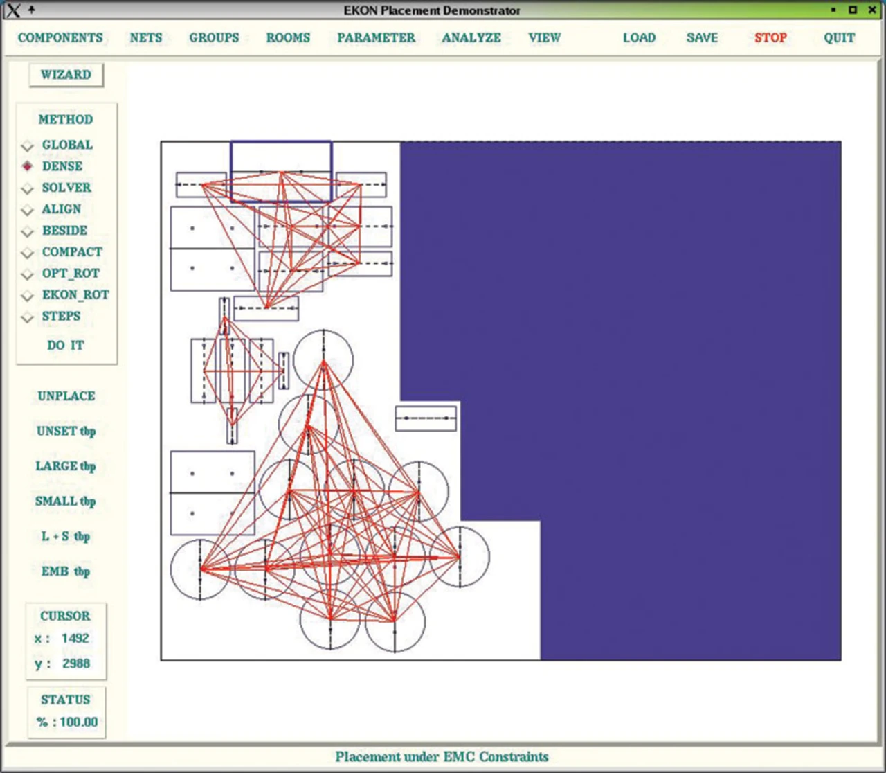 Mit diesem neuen Werkzeug lassen sich die 3D-Bauteile mit ihren entsprechenden magnetischen Eigenschaften unter Anwendung eines Regelwerkes interaktiv oder auch automatisch optimal anordnen. Über eine ASCIISchnittstelle werden dem Platzierungstool alle notwendigen Informationen bekannt gegeben – beispielsweise die Abmaße der Bauteile, die Bauteilarten, die Platzierungsflächen, mögliche Sperrflächen und alle relevanten Entwurfsregeln (Mindestabstände der Bauteile). Mehrere Bauteile lassen sich thematisch zu Gruppen zusammenfassen (z.B. »Eingangsfilter«), und vorplatzierte Bauteile wie beispielsweise ein Stecker werden ebenfalls von dem Tool berücksichtigt. Des Weiteren können mehrere Leiterplattenebenen für die Platzierung der Bauteile spezifiziert sein.