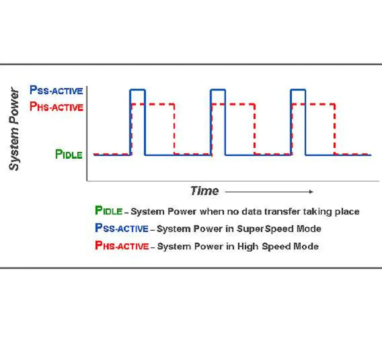 Neu ist auch »Function Suspend« für das Power-Management einzelner Funktionen von Kombigeräten. Strom spart ebenfalls der LTMMechanismus (Latency Tolerance Messaging). Ein Gerät kann dem Host damit anzeigen, welche Verzögerung es maximal zwischen der Meldung des ERDY-Status und dem Eintreffen einer Antwort tolerieren kann. Der Host kann diese Latenz-Toleranz beim Power-Management des Systems berücksichtigen. Bild 2 vergleicht die System-Leistungsaufnahme bei SuperSpeedund High-Speed-Datentransfers. Zwar nimmt ein USB-3.0-System im aktiven Zustand mehr Leistung auf, doch muss es dank seiner höheren Datenrate und wegen verschiedener Energieeffizienz- Funktionen nicht so lange aktiv bleiben. So erklärt es sich, dass ein SuperSpeed-Transfer bis zu 50% weniger Leistung benötigen kann als ein High-Speed-Transfer – ein entscheidender Aspekt für batteriebetriebene Geräte wie etwa Mobiltelefone.