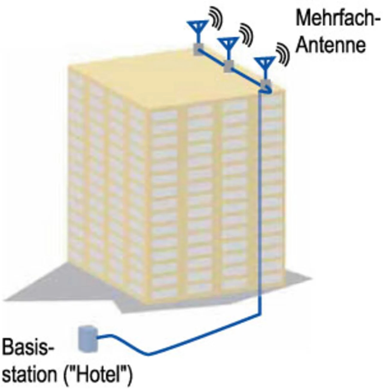Nützlich kann diese Flexibilität sein, wenn die Dachrand-Diffraktion die Ausbreitung der ankommenden Signale beeinträchtigt [13] und dem System wertvolle Kapazität nimmt. Die in Bild 7 gezeigte, horizontal über eine weitere Strecke verteilte Anordnung vertikal polarisierter RRH-Antennen zum Beispiel würde nicht nur die die kapazitätsbeeinträchtigende Wirkung der Dachrand-Diffraktion aufheben, sondern auch das Erscheinungsbild positiv beeinflussen, da eine vertikale Montage auf einem großen Antennenmast möglich wäre.