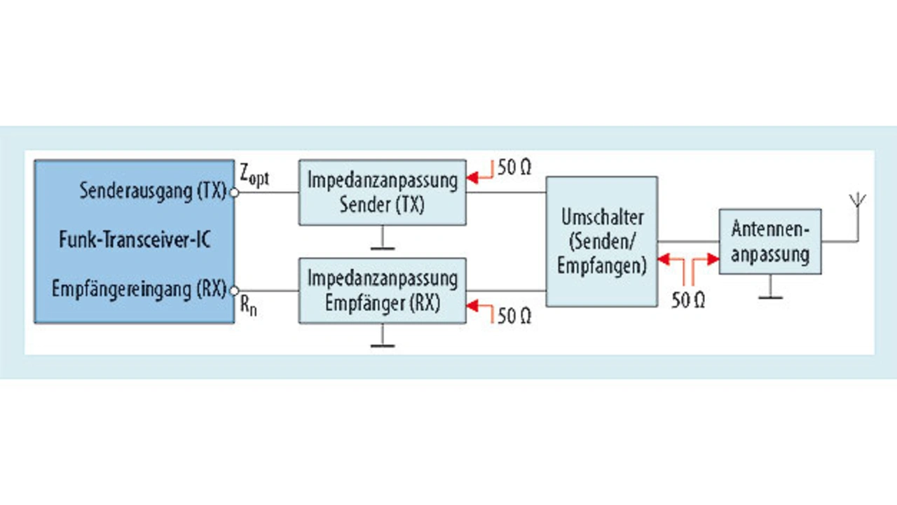 Aufgrund der Reziprozitätstheorie ist die Impedanz der Antenne sowohl beim Senden als auch beim Empfangen gleich. Im Blockschaltbild eines Funktransceivers (Bild 3) haben deshalb alle Tore des Umschalters (Senden/Empfangen) eine Impedanz von 50 Ω. Die Sender- und Empfänger-Anpassungsnetzwerke transformieren dazu die Ausgangs- und Eingangsimpedanz des Transceiver-ICs auf 50 Ω.