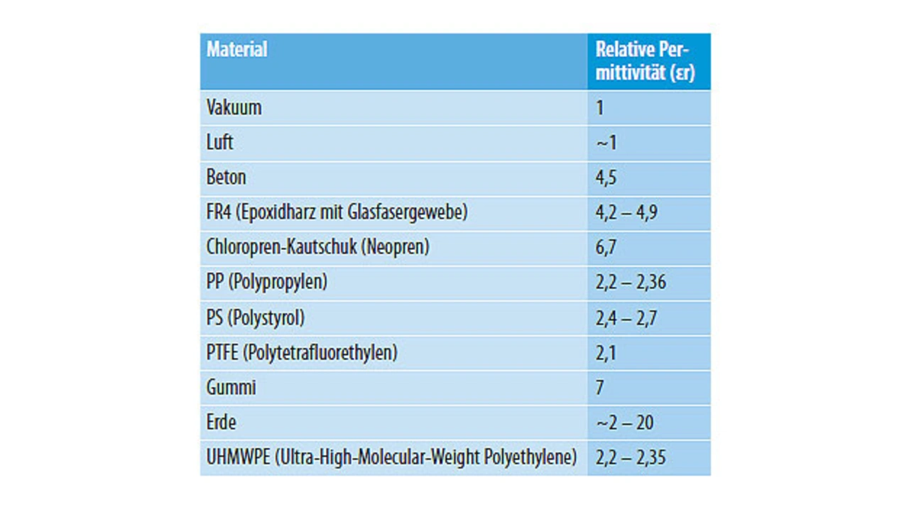 In der Folge kann eine Antenne, die für einen bestimmten Bruchteil einer Wellenlänge ausgelegt ist, zu lang sein, wenn sie statt von Luft von Leiterplattenbasismaterial umgeben ist. Eine PCB-Antenne hat deshalb im Vergleich zu einer senkrecht montierten Drahtantenne immer eine kürzere Länge. Relative Permittivitätswerte gängiger Materialien sind in der Tabelle 2 aufgeführt.