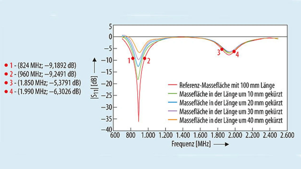 Die Kurve im Bild 7 verdeutlicht anhand der simulierten Rückflussdämpfung einer Antenne den Einfluss der Massefläche. Die rote Kurve gilt für einen Monopol mit einer Massefläche mit einer Länge von 100 mm. Bei den anderen Kurven wurde die Länge der Massefläche um jeweils 10 mm verkleinert – die orange Kurve zeigt die gleiche Antenne auf einer 60 mm langen Platine, was einer Kürzung von 40 mm entspricht.