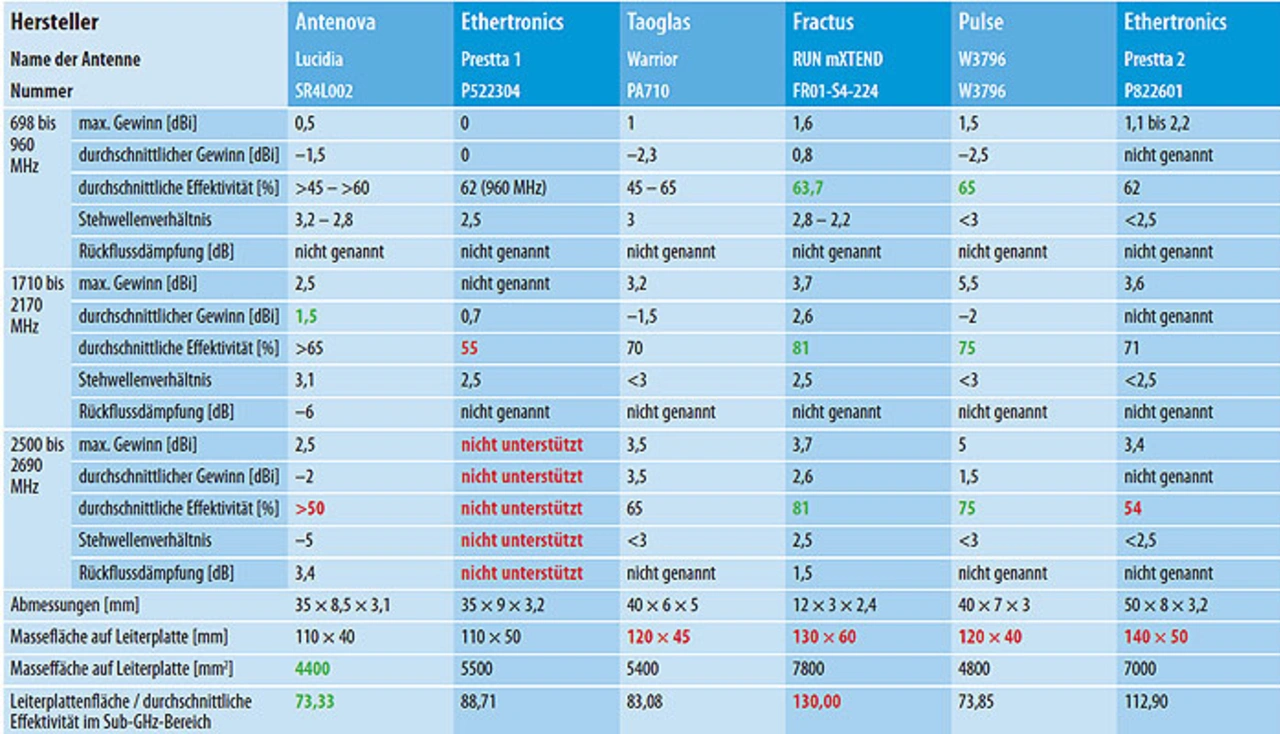 Einen Vergleich von Antennen unterschiedlicher Hersteller anhand der Datenblattangaben zeigt Tabelle 4. Die guten und schlechten Werte sind in der Tabelle mit den Farben grün und rot markiert. Ein genauer Blick auf die Herstellerangaben in Tabelle 4 verdeutlich, dass eine große Platine zu guten Ergebnissen in der Antenneneffektivität führt. Die Größe der Testplatinen wurde von den Herstellern sicherlich nicht willkürlich gewählt. Bei der Presta 2 von Ethertronics wurde die Platine wahrscheinlich auf 140 mm verlängert, um gute Ergebnisse im Sub-GHz-Bereich zu erzielen. Die Presta unterstützt aber auch das LTE-Band bei 2600 MHz nicht. Wenn die Platinengröße im Verhältnis zur Antenneneffektivität betrachtet wird, dann zeigt in der Tabelle 4 die Antenne Lucidia von Antenova mit dem Wert 73,33 das beste Ergebnis.