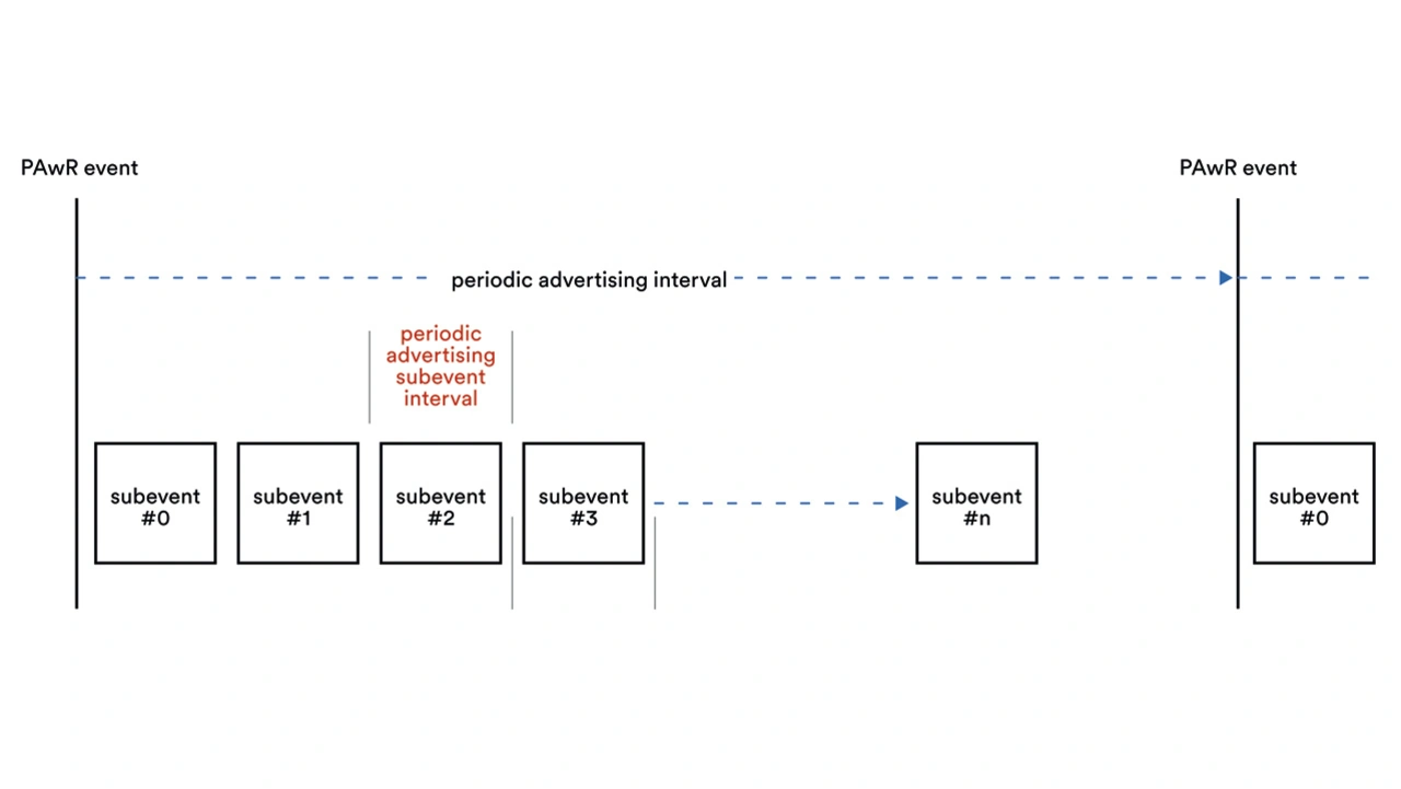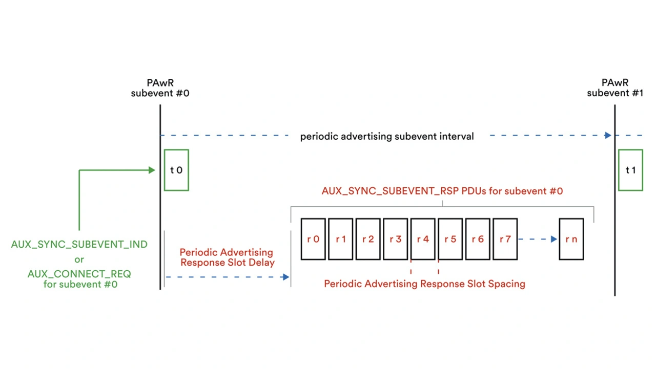 Ein PAwR-Ereignis enthält mehrere Unterereignisse, wobei jedes Unterereignis aus einer Broadcast-Daten-PDU AUX_SYNC_SUBEVENT_IND oder einer Verbindungsanforderung AUX_CONNECT_REQ PDU besteht, die in einem bekannten PAwR-Unterereignisintervall übertragen wird. Auf Antworten auf AUX_SYNC_SUBEVENT_IND-PDUs folgt eine Reihe von Zeitschlitzen, die für AUX_SYNC_SUBEVENT_RSP-Antwort-PDUs reserviert sind, die von Beobachtern gesendet werden.