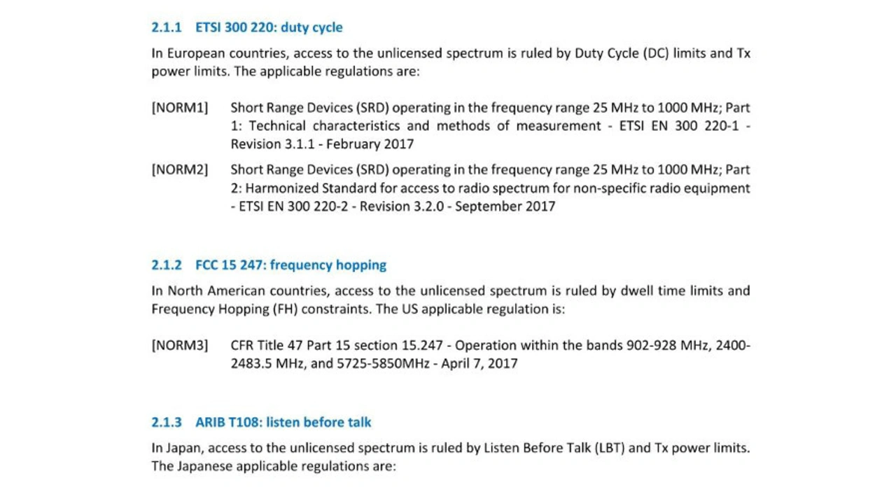 Das Dokument zu den Sigfox-Funkspezifikationen ist in fünf Sektionen untereilt und wird um drei Anhänge ergänzt. Nach einer kurzen Einleitung (Sektion 1) folgt mit Sektion 2 »Radio Hardware Engineering« der erste umfassende Abschnitt des Dokuments. Hier sind alle grundlegenden Informationen zusammengefasst, die der Funktechniker für das Entwickeln des Funk-Transceivers eines Sigfox-Endgerätes benötigt.