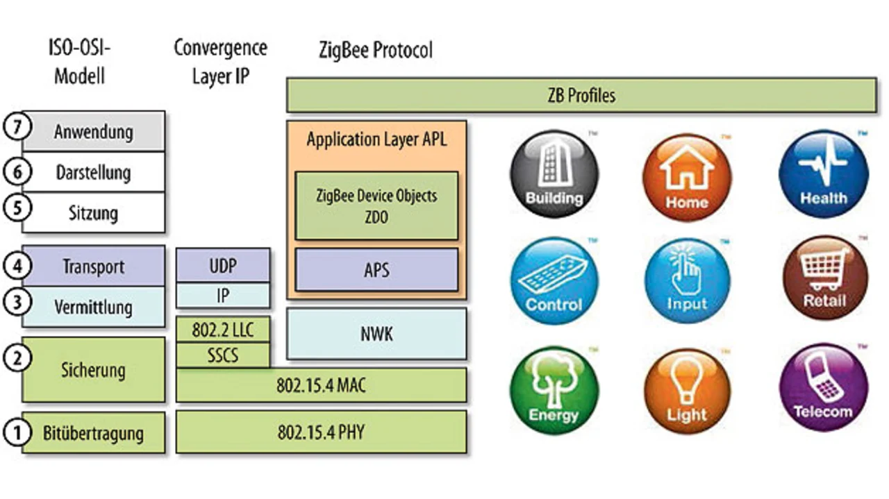 ZigBee hat seinen Ursprung 1998 aus einer Arbeitsgruppe des HomeRF-Standards. Nach einer ersten Normung der PHY- und MAC-Layer in der IEEE 802.15.4 in 2003 wurde der aktuelle Standard 2006 festgeschrieben. ZigBee umfasst wesentlich mehr als die reine Bitübertragungs- und Sicherungsschicht. Die Spezifikation definiert einen vollständigen Protokollstack bis hin zu Geräten und Geräteprofilen mit Schwerpunkt rund um die Gebäude- und Hausautomatisierung (Bild 8).
