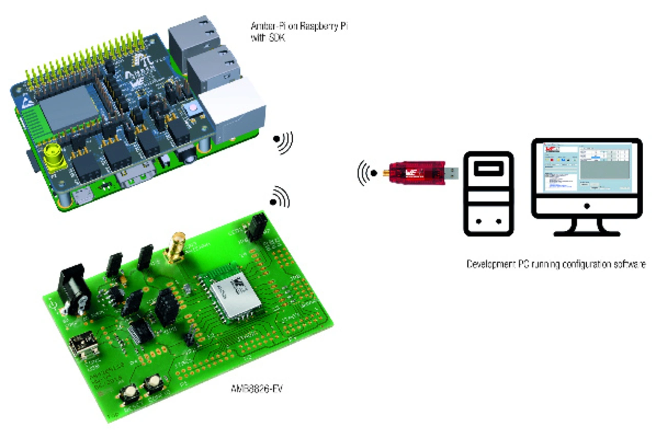 Die RS-232/RS-485-Verbindung soll nun durch eine drahtlose Verbindung – in diesem Fall mittels des proprietären AMB8826-Moduls – ersetzt werden. Es arbeitet im 868-MHz-Band und ist für den europäischen Markt geeignet. Die gleiche Hardware-Plattform mit 915 MHz (AMB9826) ist für den nordamerikanischen Markt verfügbar. Sie sind Footprint-kompatibel und setzen auf die gleichen Software-Schnittstellen. Das macht es einfacher, ein System für den weltweiten Einsatz zu entwickeln. Neben einer Antenne mit den Abmessungen 27 mm × 17 mm × 3,2 mm ist auch der eiSos-RF-Stack integriert. Trotz des Stromverbrauchs von nur 26 mA (bei 14 dBm Sendeleistung) und einem Schlafstrom von weniger als 0,2 μA kann das AMB8826 unter geeigneten Bedingungen (externe Antenne, 6 m Antennenhöhe über Boden) mit seinem Long-Range-Modus eine Reichweite von bis zu zehn Kilometern erreichen.