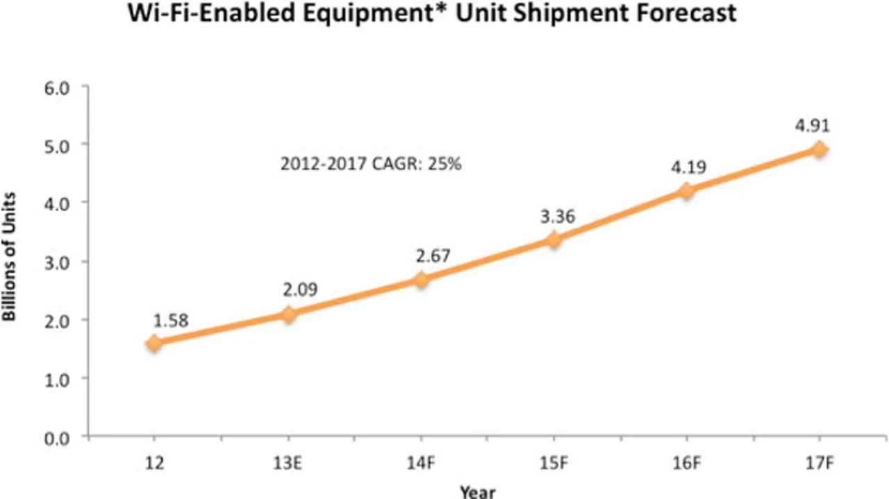 Die Wachstumszahlen sind beeindruckend. So stieg die Anzahl WiFi-fähiger Geräten im Jahr 2010 um 54 Prozent gegenüber dem Vorjahr, gefolgt von einem Zuwachs in Höhe von 46 Prozent im darauf folgenden Jahr. Für dieses Jahr erwarten die Analysten von IC Insights ein weiteres Plus in Höhe von 32 Prozent auf 2,1 Mrd. Geräte. Zwischen 2012 und 2017 soll das durchschnittliche Wachstum pro Jahr 25 Prozent betragen. Kumulativ werden die Wi-Fi-fähigen Geräte bereits 2014 die 10-Mrd.-Marke überschreiten, nur sechs Jahre nachdem kumulativ die 1-Mrd.-Marke durchbrochen wurde.