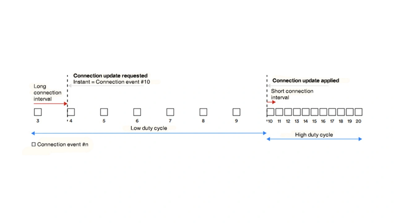 Durch Ändern des Verbindungsintervalls entsteht Latenz. In der Praxis bedeutet dies, dass bis zu sechs Verbindungs-Ereignisse erforderlich sind, um die von einem Gerät gewünschte Änderung des Verbindungsintervalls umzusetzen (siehe Bild 1).