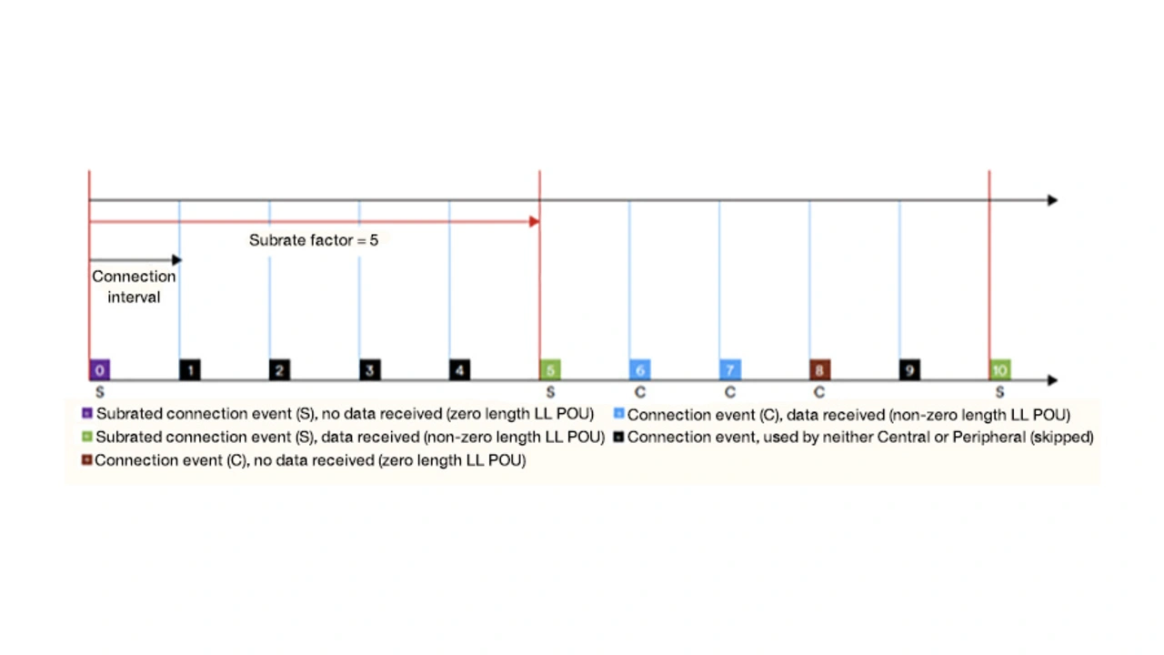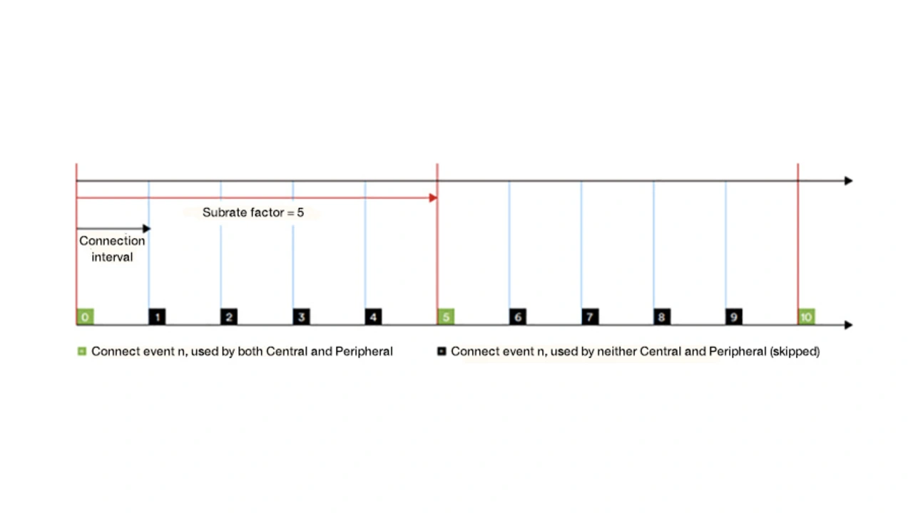 Kommt dies in einer zeitsensiblen Applikation vor, wie etwa beim schnellen Auslesen eines Sensors, ist eine derartige Latenz unter Umständen inakzeptabel. Abhilfe schafft das so genannte »connection subrating«, mit dem sich der Zeitaufwand für den Wechsel von einem langen zu einem kurzen Verbindungsintervall verkürzen lässt. Hierfür werden die Zentrale und die Peripherieeinheit angewiesen, Verbindungs-Ereignisse zu überspringen – abhängig davon, ob im letzten Verbindungsereignis Daten übertragen wurden oder nicht.