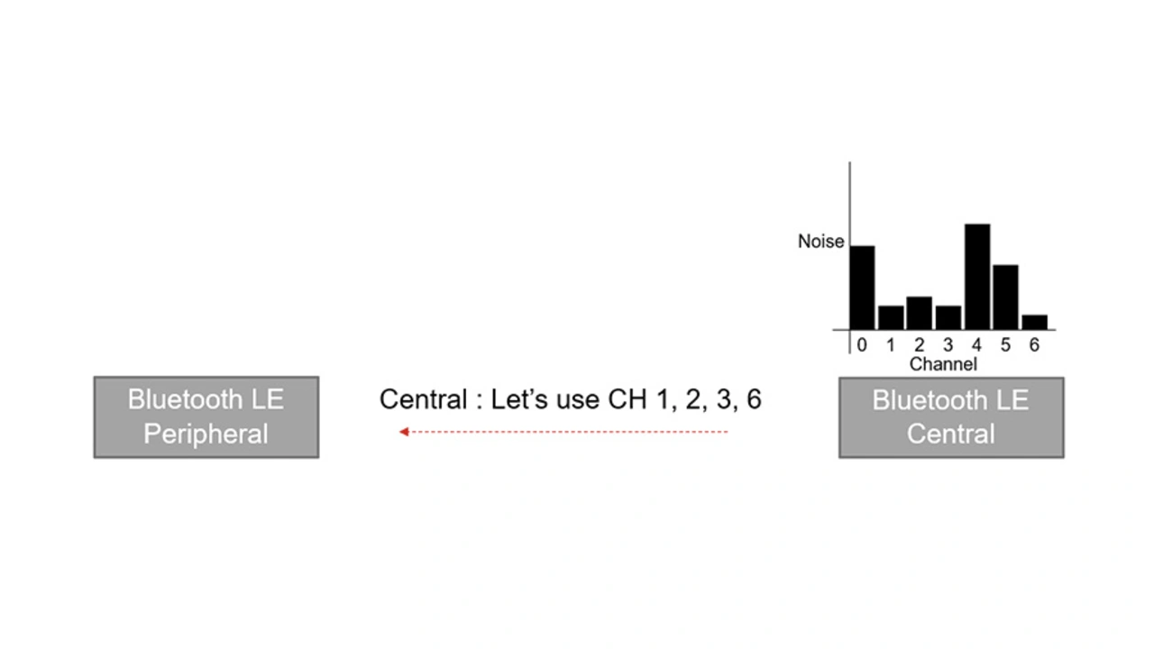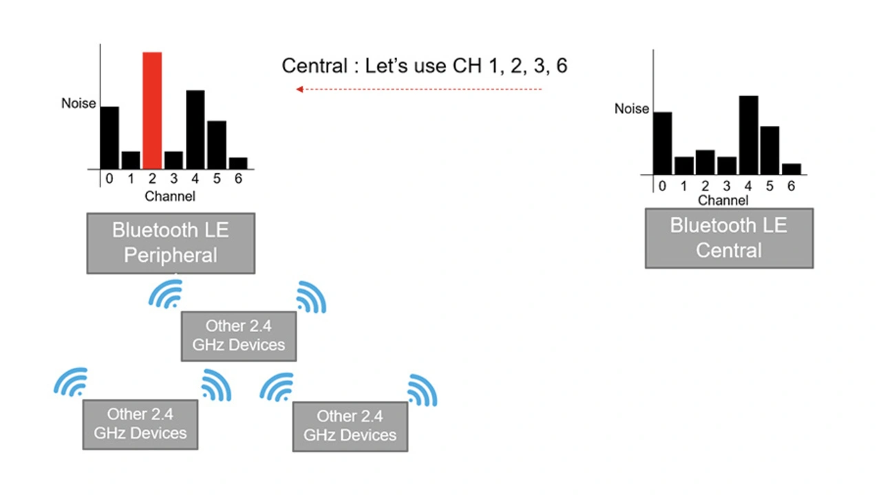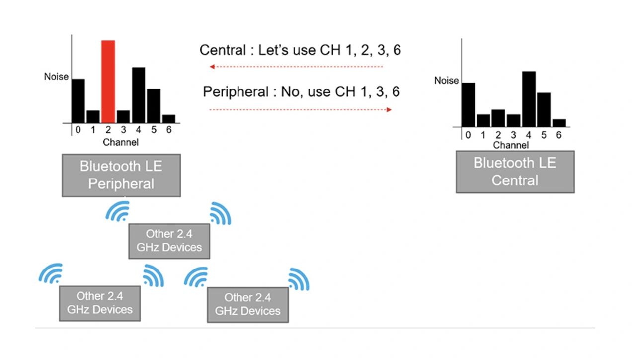 Da die Priorität allein vom zentralen Gerät festgelegt wurde, hatten Peripheriegeräte keinerlei Mitspracherecht, was die verwendeten Kanäle betraf. Da Bluetooth-Geräte aber über immer größere Distanzen kommunizieren können, kann es vorkommen, dass Peripherie und Zentrale unterschiedliche Bedingungen in ihrer Umgebung vorfinden. Diese Unterschiede können problematisch werden, wenn im Kanalplan auch solche Kanäle verzeichnet sind, die aus Sicht der Zentrale keine nennenswerten Störungen aufweisen, beim Peripheriegerät aber in den Kanälen das Störaufkommen erheblich ist (Bild 5).