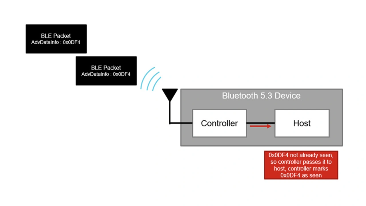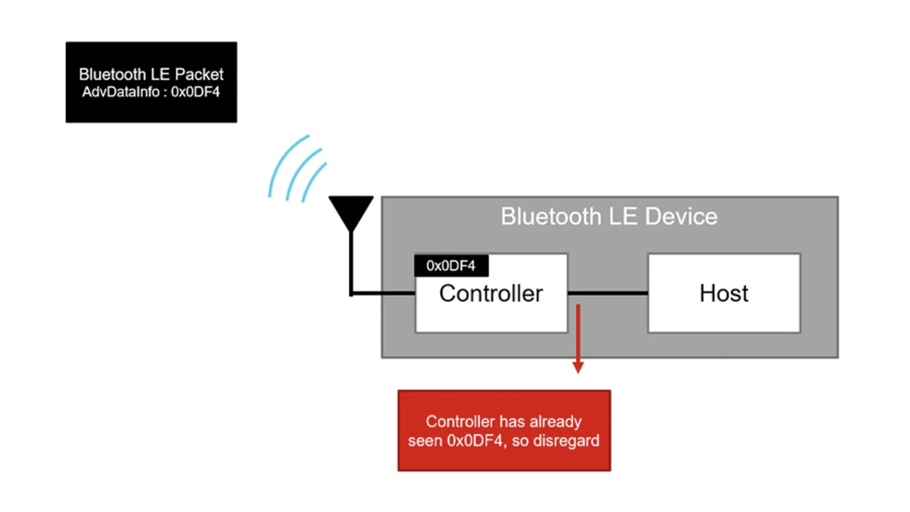 Deshalb können sendende Geräte jetzt beim periodischen Advertising ein AdvDataInfo-Feld in die von ihnen gesendeten Pakete einfügen, damit die empfangenden Einheiten feststellen können, ob sie das betreffende Paket schon einmal empfangen haben. Ist dies der Fall, wird der Empfang abgebrochen, damit die Funkeinheit weniger Energie benötigt. Außerdem wird hierdurch vermieden, dass die Funkeinheit das redundante Paket an den Hostprozessor überträgt. Durch Filtern der Daten, die an den Hostprozessor weitergegeben werden, können Geräte ihren Energiebedarf senken, indem sie redundante Pakete ignorieren (siehe Bilder 7 und 8).