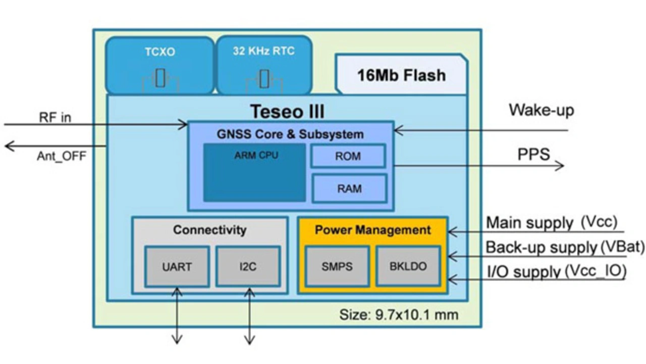 Seinen neuesten Satellitenempfänger-IC für GPS, Galileo, Glonass, BeiDou und QZSS (Quasi-Zenith Satellite System), Teseo III, hat STMicroelectronics um Flash-Speicher (16 Mbit) und Taktgenerator (TCXO und RTC) ergänzt in ein kleines Modul (9,7 × 10,1 mm) gepackt.