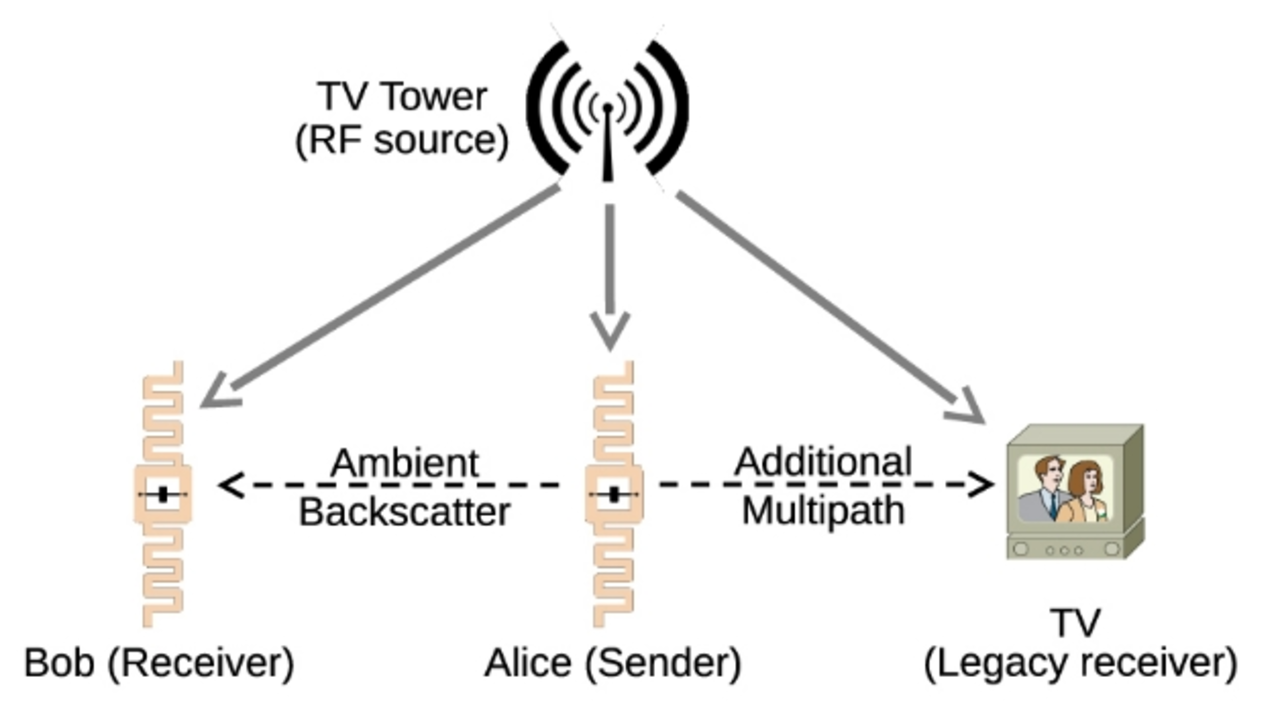 Elektrosmog umgibt uns ständig. Er kommt vom Rundfunk sowie vom Mobilfunk wie Basisstationen und Handys. Bei der »Ambient Backscatter«-Technik (Umgebungs-Rückstreuung) nutzen Forscher an der Universität von Washington in Seattle diese Funkenergie sowohl als Energiequelle als auch als Kommunikationsmedium. So können zwei batteriefreien Geräten durch Rückstreuung bestehender Funksignale per Morse-Code miteinander kommunizieren. Dadurch ist die Backscatter-Kommunikation um Größenordnungen energieeffizienter als herkömmliche Funkkommunikation. Da sie die HF-Signale um uns herum nutzt, ist es nicht erforderlich, eine eigene Energie-Infrastruktur zu implementieren wie z.B. bei RFID.