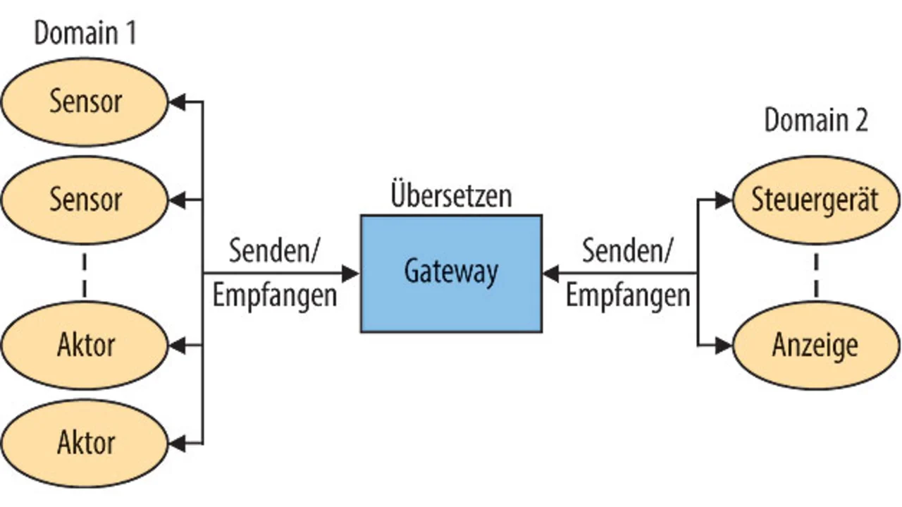 Je nach Systemarchitektur muss die Gateway-Funktion nicht zwingend mittels eines dedizierten Gerätes implementiert werden. Sie kann auch direkt in die Endgeräte einer der beiden Domänen integriert werden. Dies würde sich z.B. bei leistungsfähigen Steuergeräten anbieten.