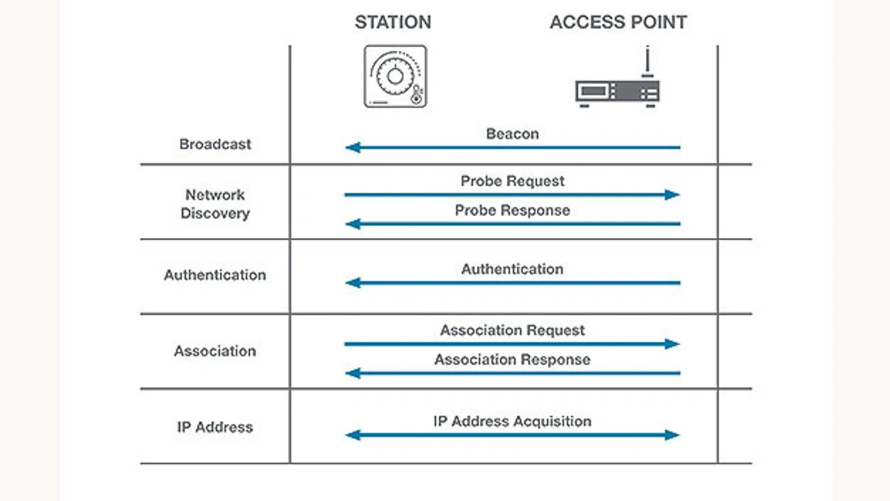 Um die größtmögliche Energieeinsparung zu erzielen, kann sich das IoT-Gerät vollständig vom Zugriffspunkt (AP) lösen und in den Abschaltmodus wechseln, bei dem die Stromaufnahme auf weniger als 1 µA sinkt. Jedes Mal, wenn der Client jedoch Daten senden möchte, muss er sich erneut mit dem AP verbinden und eine IP-Adresse erwerben, was einige Sekunden dauern kann. Dieser Prozess (Bild 2) erhöht die Latenzzeit für alle Informationen, die kommuniziert werden müssen, und er führt zu einer erheblichen Stromaufnahme. Darüber hinaus kann das IoT-Gerät keine Informationen empfangen, wenn die Verbindung getrennt (dissoziiert) wurde, womit es sich auch nicht über WLAN aus der Ferne aktivieren lässt.