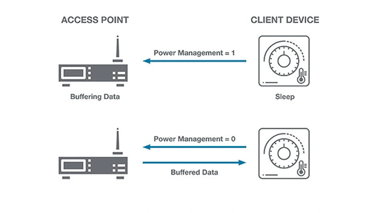 Viele IoT-Geräte verbringen den Großteil der Zeit im Leerlauf, ohne dass Daten übertragen werden. Die WLAN-Standards verfügen über zwei Mechanismen, um die Stromaufnahme zu reduzieren, sobald das Gerät keine Daten mehr sendet oder empfängt.