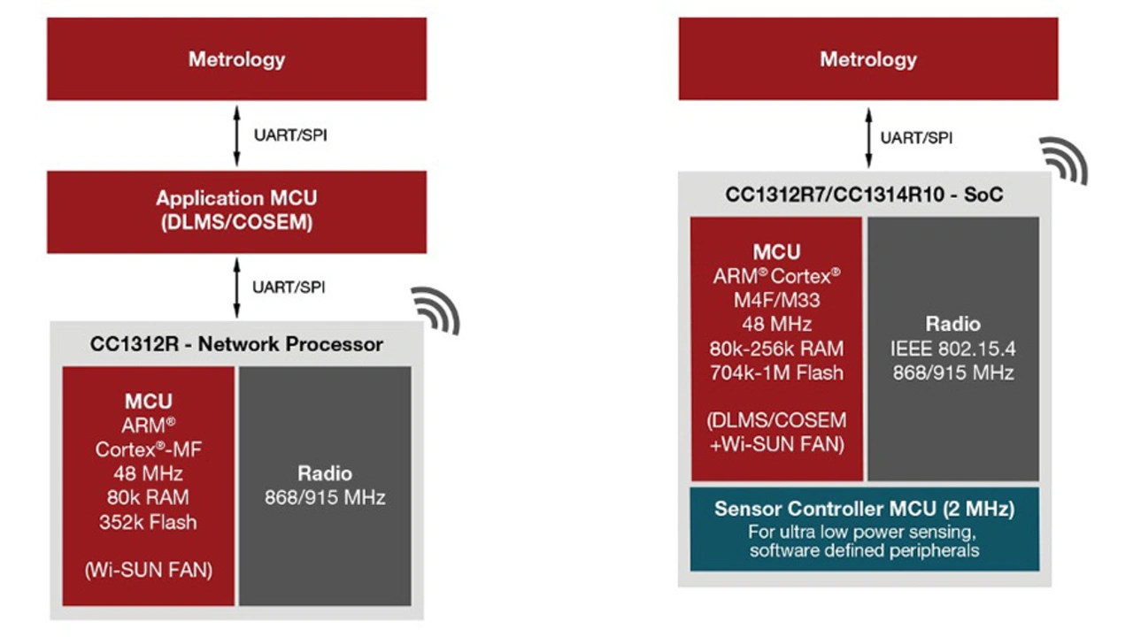 Die Software für DLMS/COSEM (Device Language Message Specification / Companion Specification for Energy Metering) und die Metrologie läuft dagegen auf dem Applikationsprozessor. Alternativ können der Wi-SUN-Stack und die Applikation auf ein und demselben Baustein laufen, z.B. auf dem mit mehr Speicher ausgestatteten CC1352P7, und für die Metrologie wird ein eigener Mikrocontroller vorgesehen.
