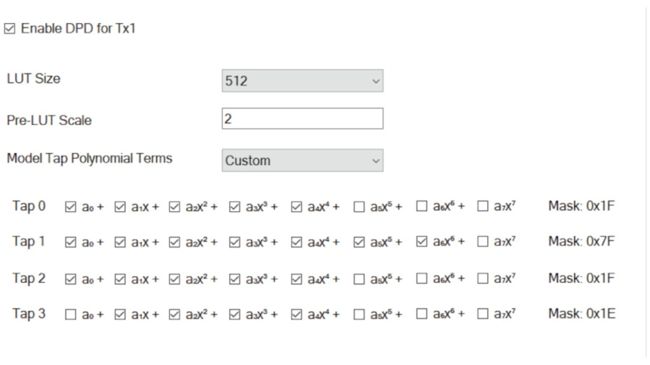 Entwickler können die Anzahl der Polynomterme für jeden Tap konfigurieren. Der ADRV9002 bietet drei Memory Term Taps und einen Cross Term Tap, jeweils mit einer Ordnung von 0 bis 7.