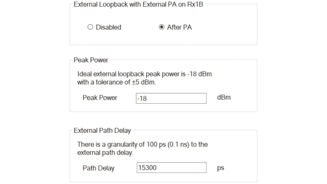 Für eine digitale Vorverzerrung müssen Entwickler einen externen Pfad am Leistungsverstärker für die Rückkopplung aktivieren und die Rückkopplungsleistung so einstellen, dass sie innerhalb des Bereichs liegt. Zu beachten ist, dass es sich um die Spitzenleistung und nicht um die durchschnittliche Leistung handelt. Eine zu hohe oder eine zu geringe Leistung beeinträchtigt die Leistungsfähigkeit der digitalen Vorverzerrung. Entwickler müssen auch die Verzögerung des externen Rückkopplungspfads einstellen, die sich mit External_Delay_Measurement.py ermitteln lässt. Das Skript hierzu befindet sich im Installationspfad der ADRV9002-Evaluierungssoftware im Ordner »IronPython«.