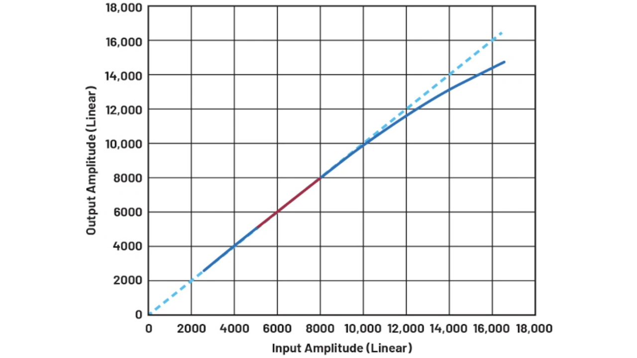 Rx/Tx-Normierung: Entwickler sollten die Empfänger-/Sendernormierung auf den Bereich einstellen, in dem die Daten linear sind. In Bild 6 ist der lineare Bereich in rot dargestellt. In diesem Bereich hat der Wert der Daten noch nicht den Kompressionsbereich erreicht und ist hoch genug für die Berechnung der Verstärkung. Sobald der Bereich ausgewählt ist, kann die DPD-Stufe die Verstärkung von Sender und Empfänger schätzen und den Algorithmus weiterverarbeiten. In den meisten Fällen sollte ein Wert zwischen –25 und –15 dBFS für Standard-Leistungsverstärker ausreichen. Dennoch sollten HF-Entwickler wissen, dass spezielle Leistungsverstärker sehr unterschiedliche Formen von AM/AM-Kurven haben können, was eine entsprechende Anpassung erforderlich macht. Dies wird in den folgenden Abschnitten des Beitrags ausführlicher beschrieben.