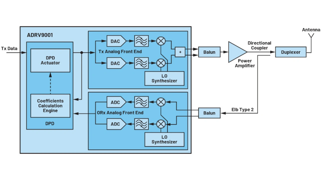 Verglichen mit der Übersteuerung des Empfängers wird diese Problematik oft übersehen. Ursache dafür ist eine nicht richtig eingestellte Rückkopplungsdämpfung. Entwickler können den Rückkopplungspfad zu stark dämpfen, so dass die Empfängerdaten zu klein werden. Standardmäßig wird für den ADRV9002 ein Spitzenwert von –18 dBm empfohlen, da dieser die Daten von analog zu digital auf einen guten bekannten Leistungspegel für die digitale Vorverzerrung bringt.