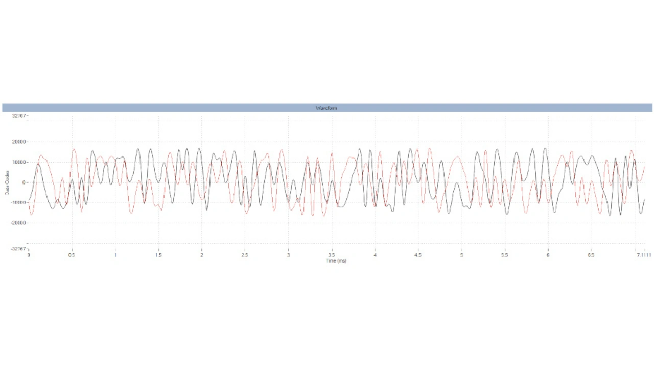 Bild 11 zeigt eine TETRA-1-Wellenform mit einer Bandbreite von 25 kHz. Der Spitzenwert ist noch weit von der digitalen Vollaussteuerung entfernt. Für den ADRV9002 wird empfohlen, mindestens ein paar dB von der Vollaussteuerung entfernt zu bleiben, um eine mögliche Übersteuerung des DAU zu vermeiden.