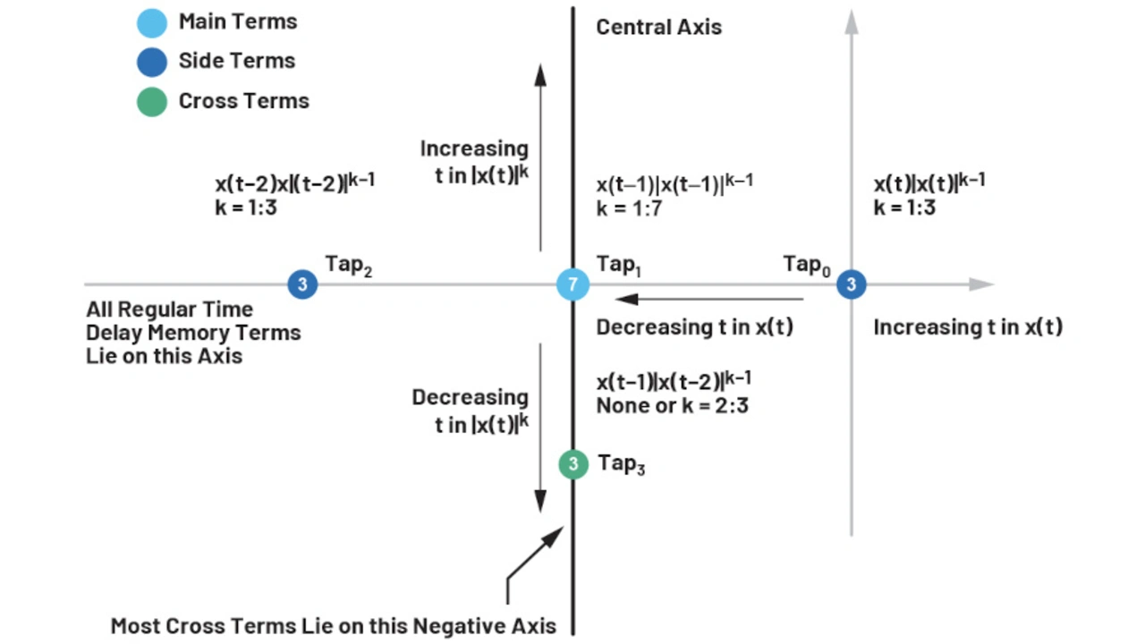 Der Unterschied ist, dass beim Kurvenanpassungsproblem eine einzelne Kurve angepasst wird, wogegen bei der digitalen Vorverzerrung auch der Memory-Effekt zu berücksichtigen ist. Der ADRV9002 hat drei Memory Taps und einen Cross Tap für die Modellierung von DPD-LUTs.