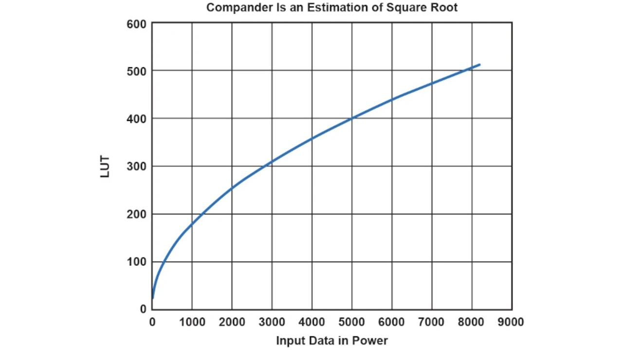 die Signalamplitude aus den vorherigen Gleichungen berechnet. Die Quadratwurzel ist jedoch eine aufwändige Operation in Bezug auf die Geschwindigkeit, und sie muss auch in die LUT (8 oder 9 bit) abgebildet werden, ergo den Kompander.