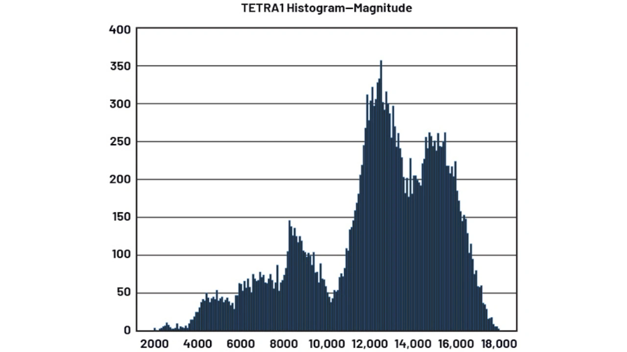 Im Histogramm der TETRA1-Standardwellenform (Bilder 22 und 23) ist zu sehen, dass die meisten Werte in Bereichen mit mittlerer bis hoher Amplitude auftreten. Dies ist darin begründet, dass der Standard TETRA1 mit einer D-QPSK-Modulation arbeitet. Dies führt dazu, dass das Signal eine konstante Hüllkurve hat. Die Spitzenleistung unterscheidet sich nicht allzu sehr von der Durchschnittsleistung. Für die digitale Vorverzerrung ist dies erwünscht. Wie bereits erwähnt, erfasst die digitale Vorverzerrung mehr Abtastwerte mit hoher Amplitude und charakterisiert daher das Verhalten des Leistungsverstärkers besser.