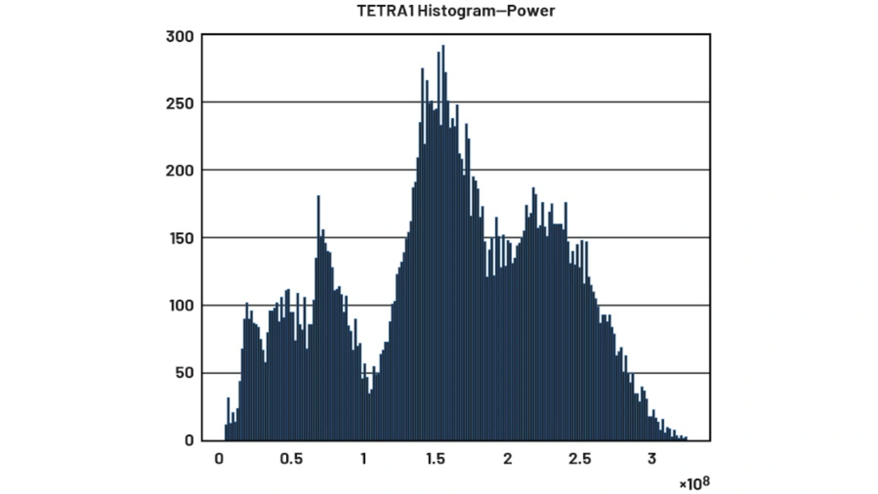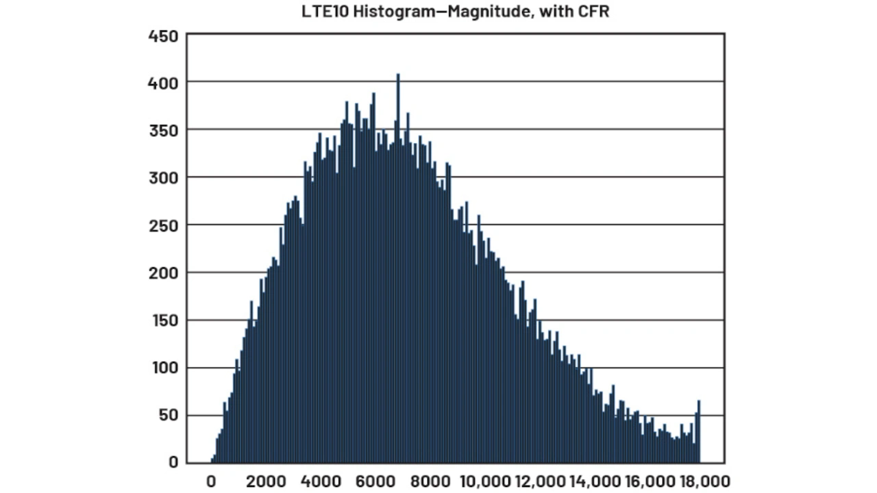 Wird der Standard LTE10 auf ähnliche Weise betrachtet, ergibt sich folgendes. LTE verwendet OFDM (Orthogonal Frequency-Division Multiplexing) als Modulationsverfahren, das zur digitalen Datenübertragung Hunderte oder Tausende Unterträger verwendet. Gegenüber TETRA-1 sind die Spitzen hier sehr weit vom Hauptdurchschnitt entfernt (Bilder 24 und 25).