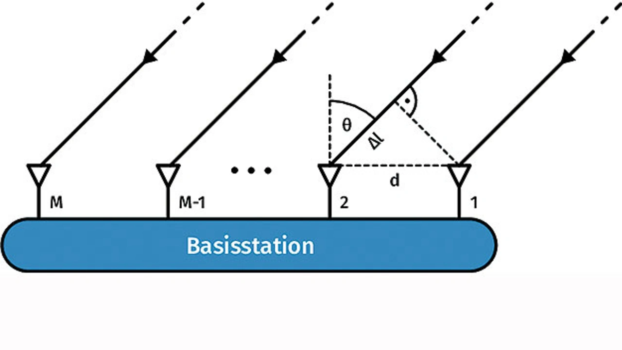 Ein unter einem Winkel θ einfallendes Signal mit Wellenlänge λ wird nun mittels der verschiedenen Antennen empfangen. Durch den Laufzeitunterschied beziehungsweise den Pfadlängenunterschied Δl zwischen der Signalquelle und den jeweiligen Antennen resultiert ein Phasenunterschied Δφ zwischen je zwei benachbarten Antennen, der sich berechnen lässt.