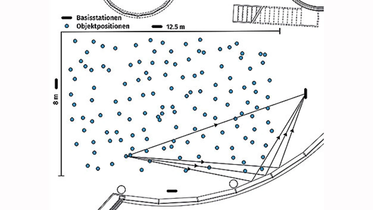 Ein grundlegend anderer Lokalisierungsansatz ist die sogenannte Triangulation, wie sie am Beispiel eines Systems mit zwei Basisstationen im Bild 1 illustriert ist. Im Gegensatz zur oben beschriebenen Trilateration wird hierbei nicht die Distanz, sondern der Winkel, unter dem sich das Objekt befindet, von mehreren Basisstationen gemessen, woraus dann schließlich die Position des Objekts ermittelt werden kann.